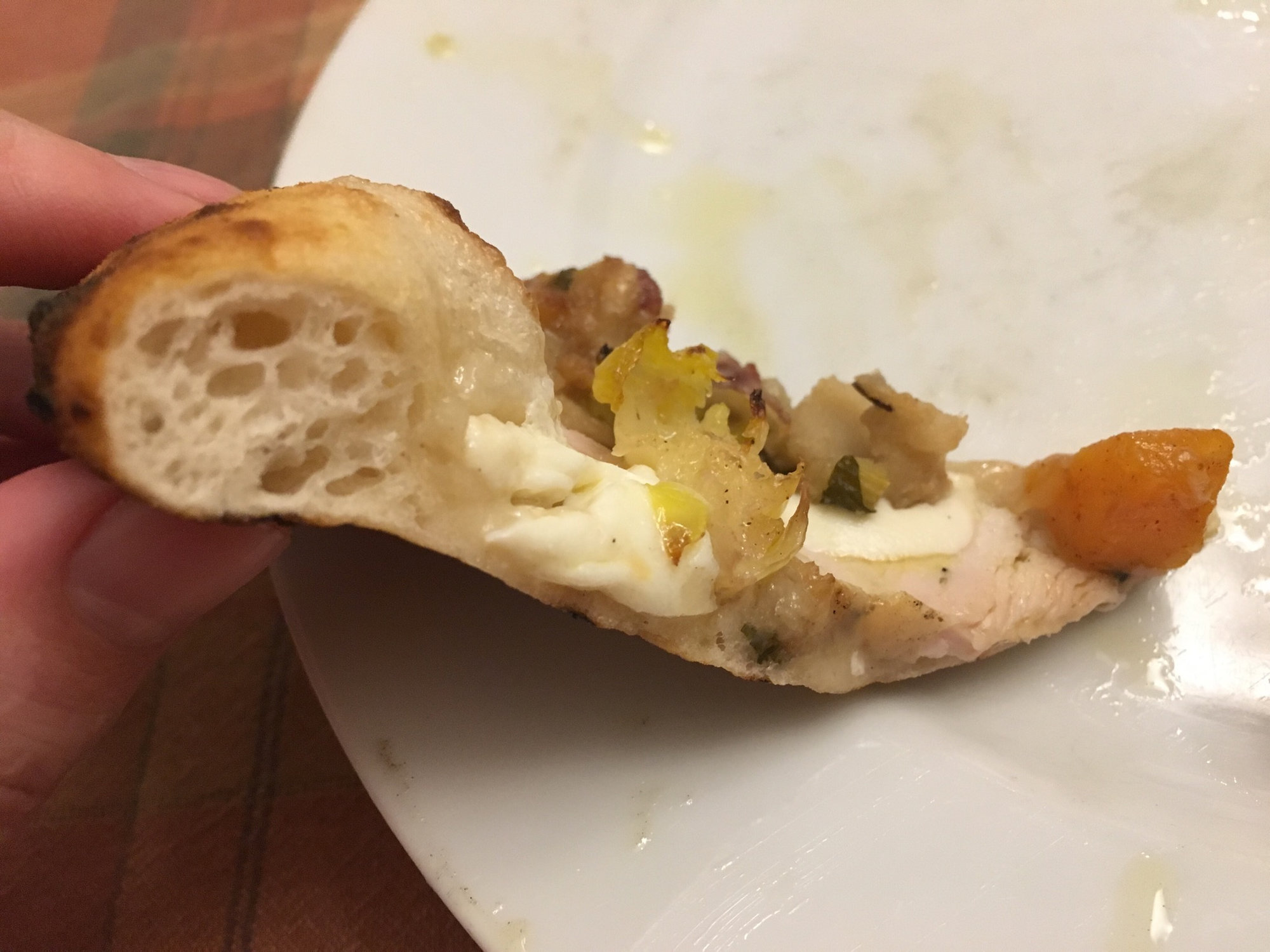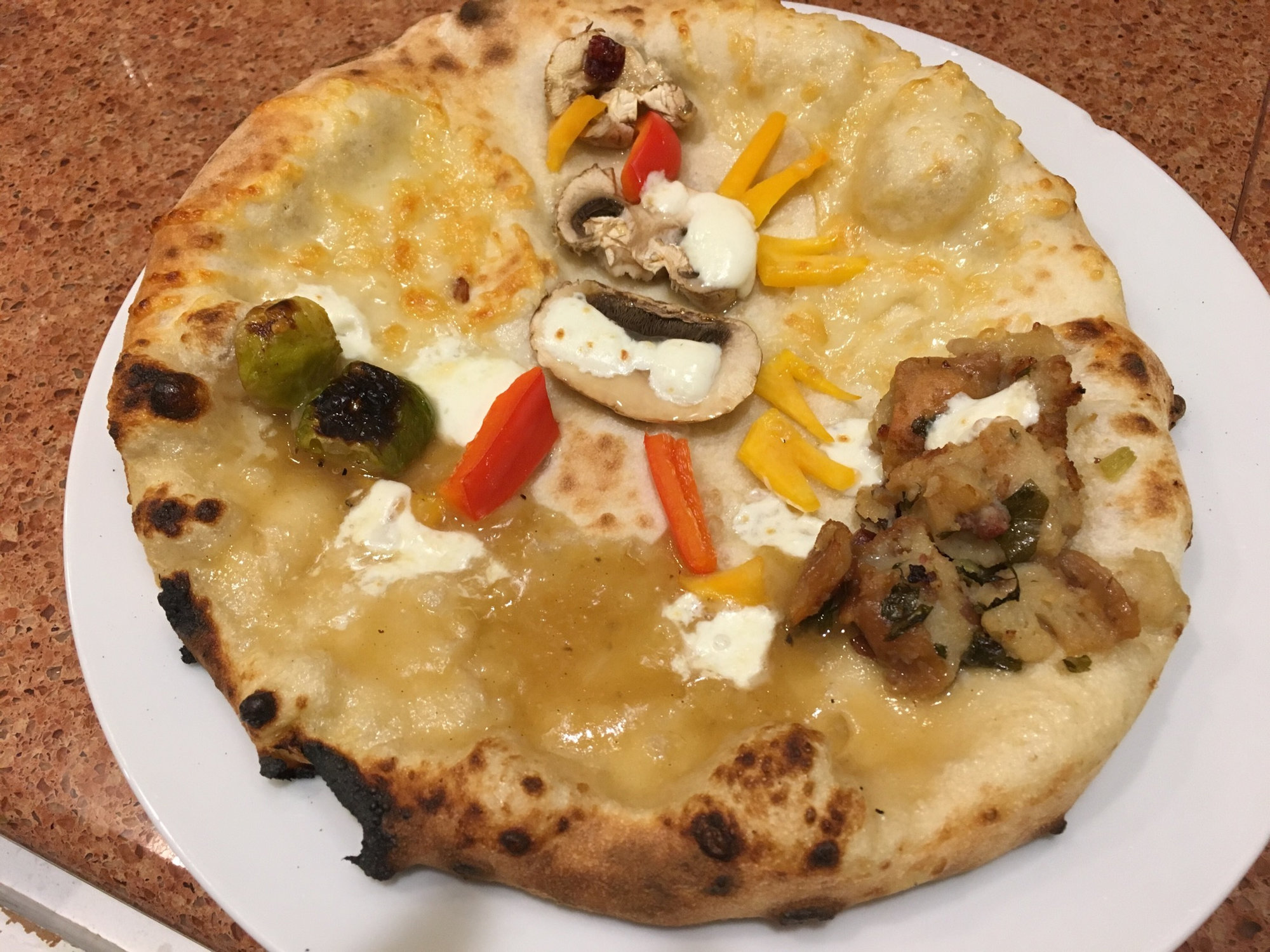My humble entry: Thanksgiving leftover pizza with gravy base, turkey, sausage stuffing, sprouts and sweet potatoes: