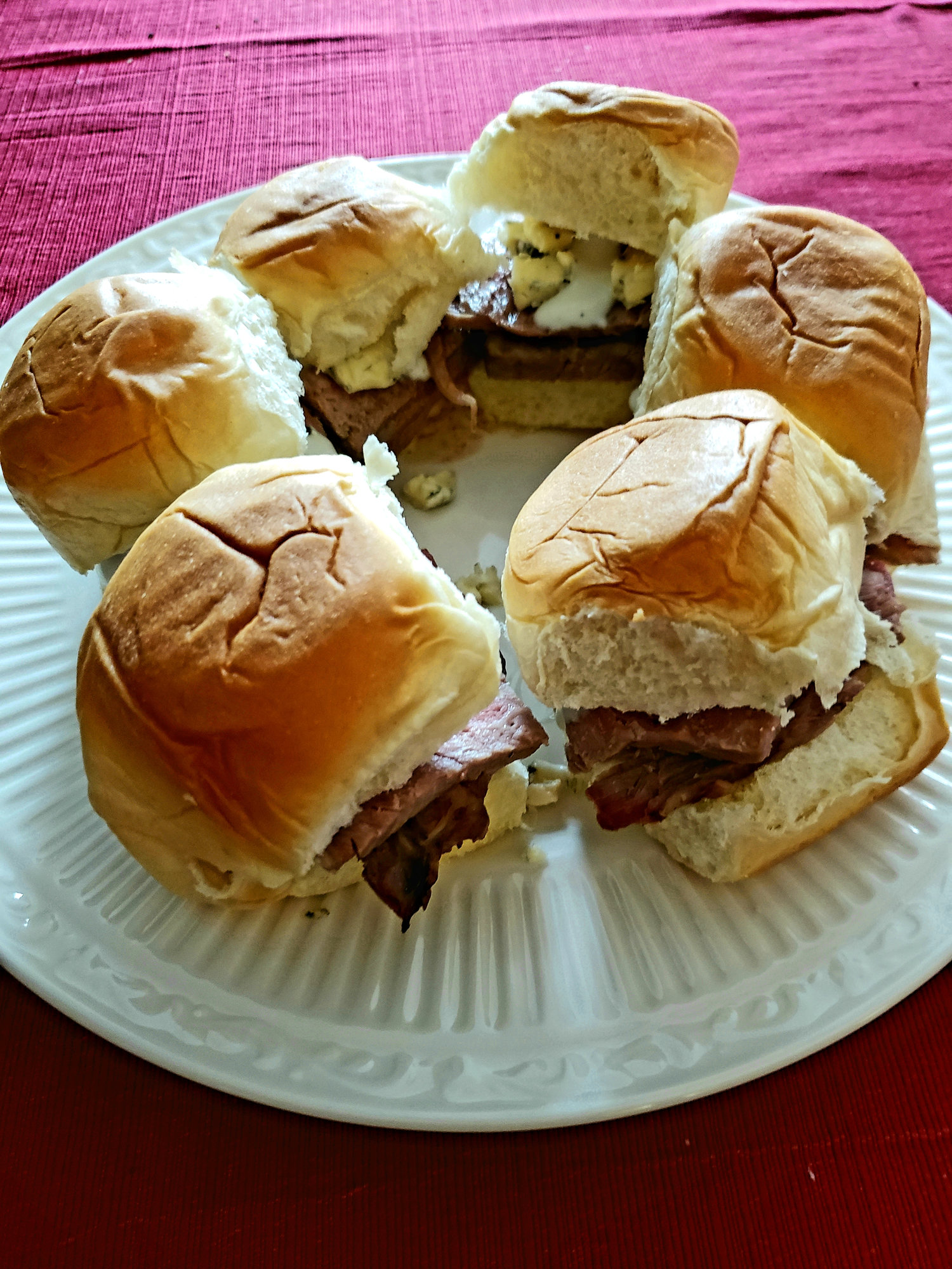 Prime rib sliders, chunks of aged bleu cheese, and a homemade bleu cheese yogurt topping.
