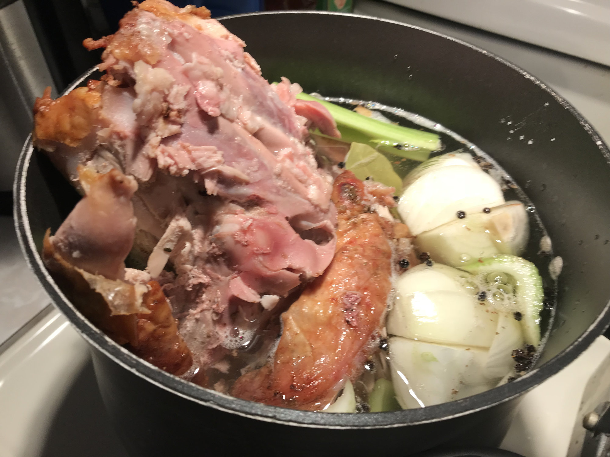 Turkey gumbo. Carcass simmered with onion, celery, carrot, peppercorn and bay leaves to make the stock.