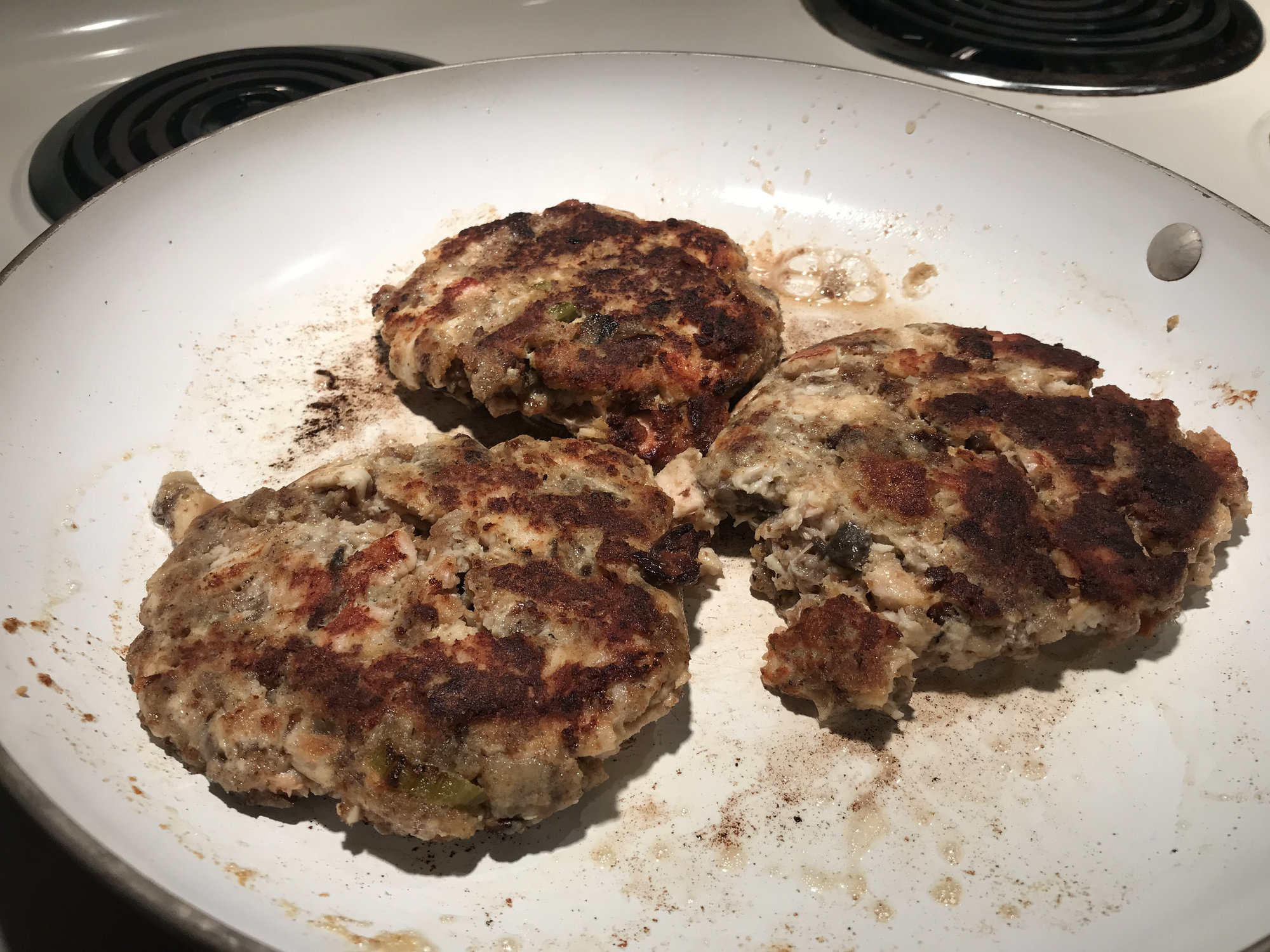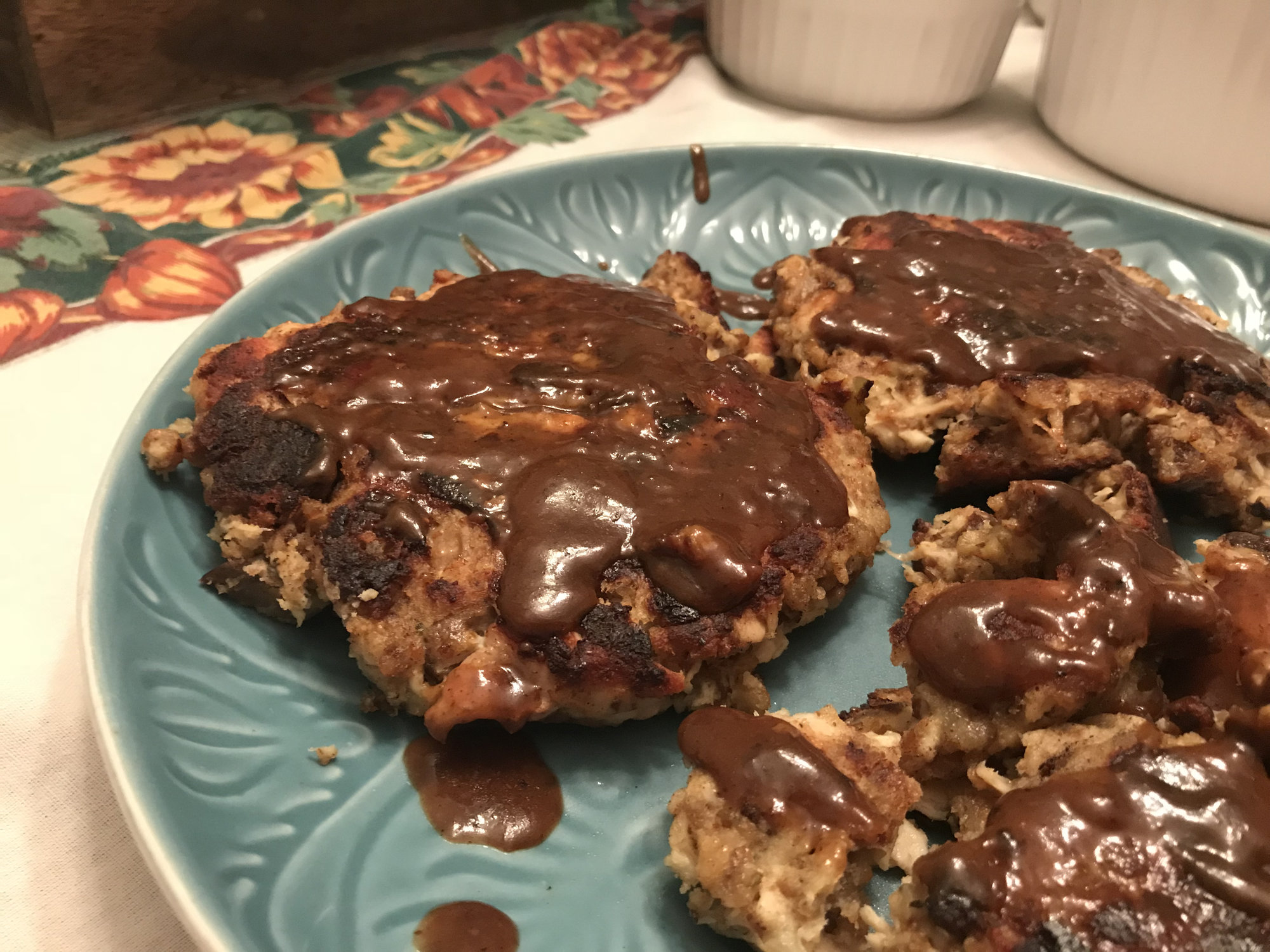 Dressing and turkey griddle cakes with an egg binder. Pan Fried in butter, finished with leftover Mad Max gravy.