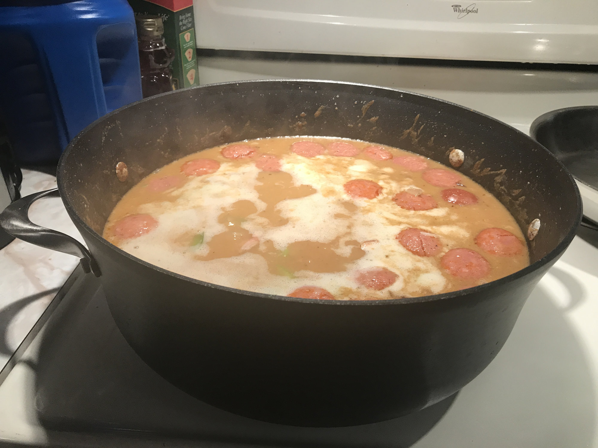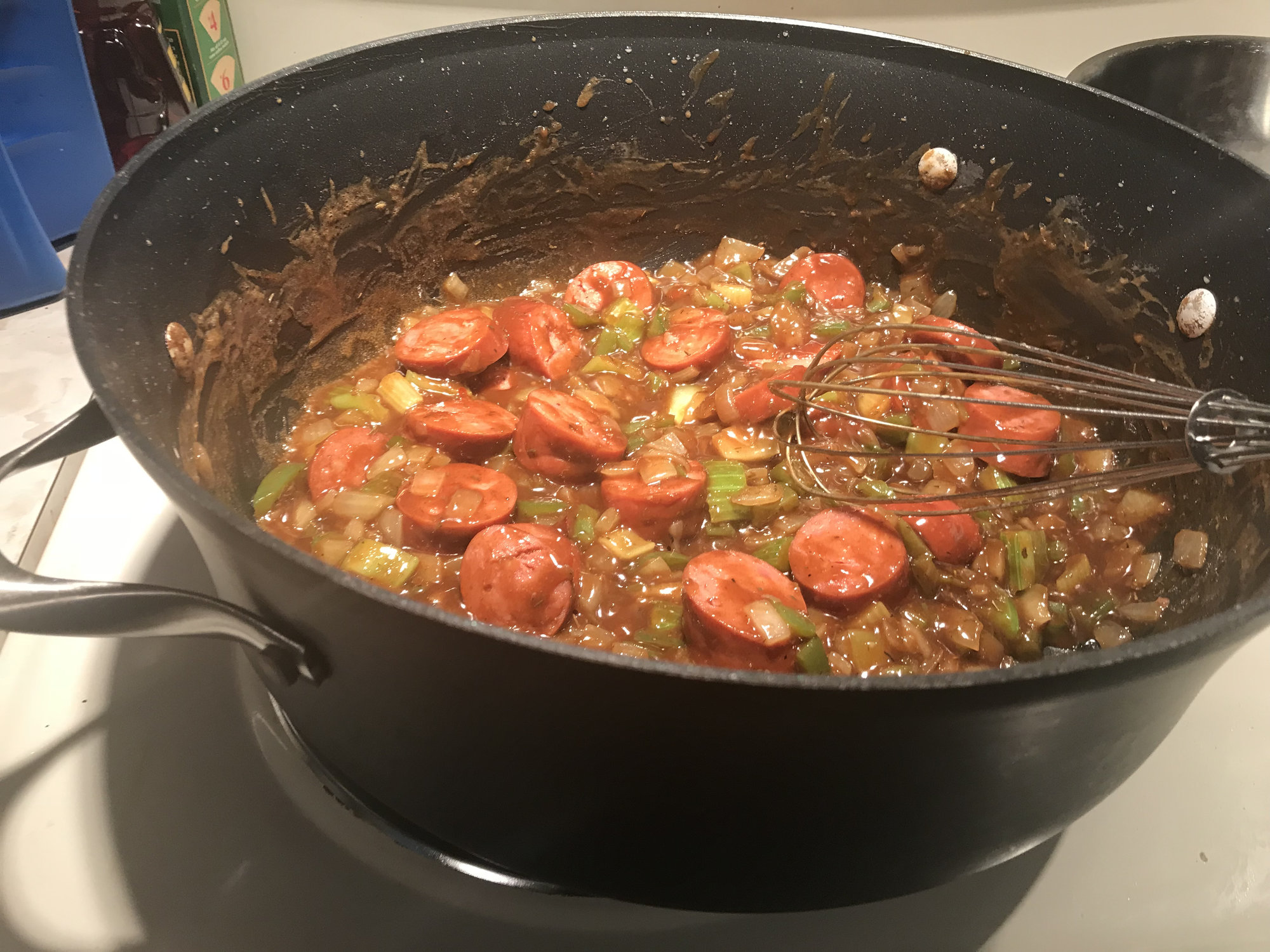 Added spicy andouille and the trinity before adding in the meat recovered from the carcass.