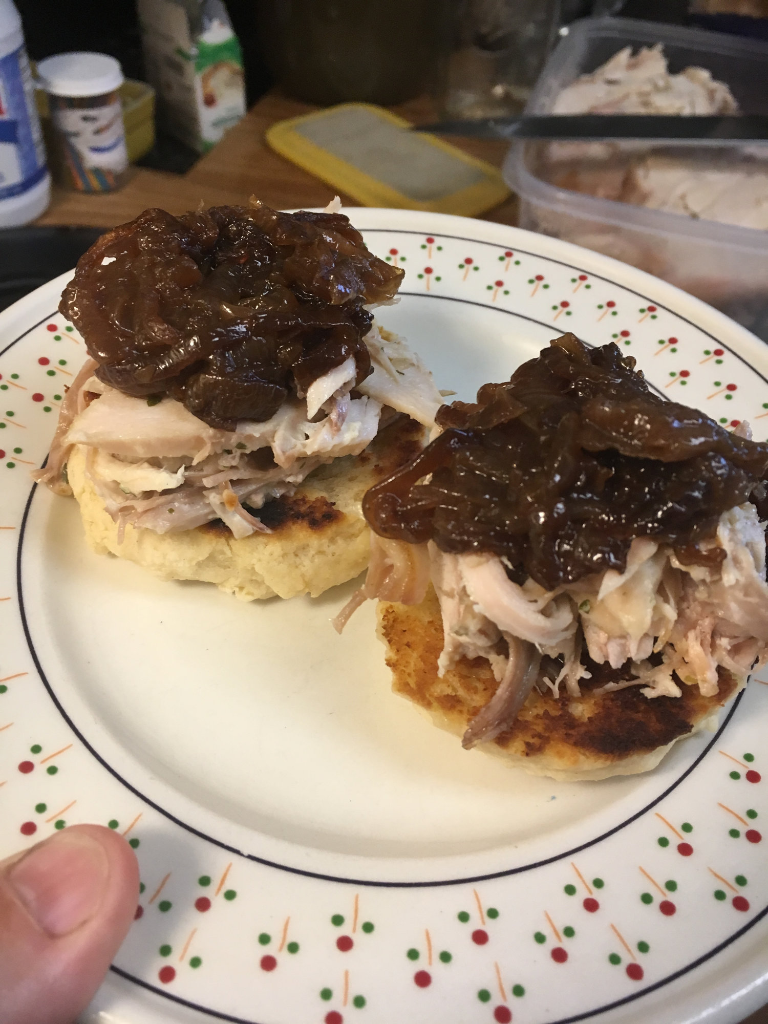 Pretty simple open face snack—biscuit buttered a grilled with turkey, boursin cheese, and brandied carmalized onions.