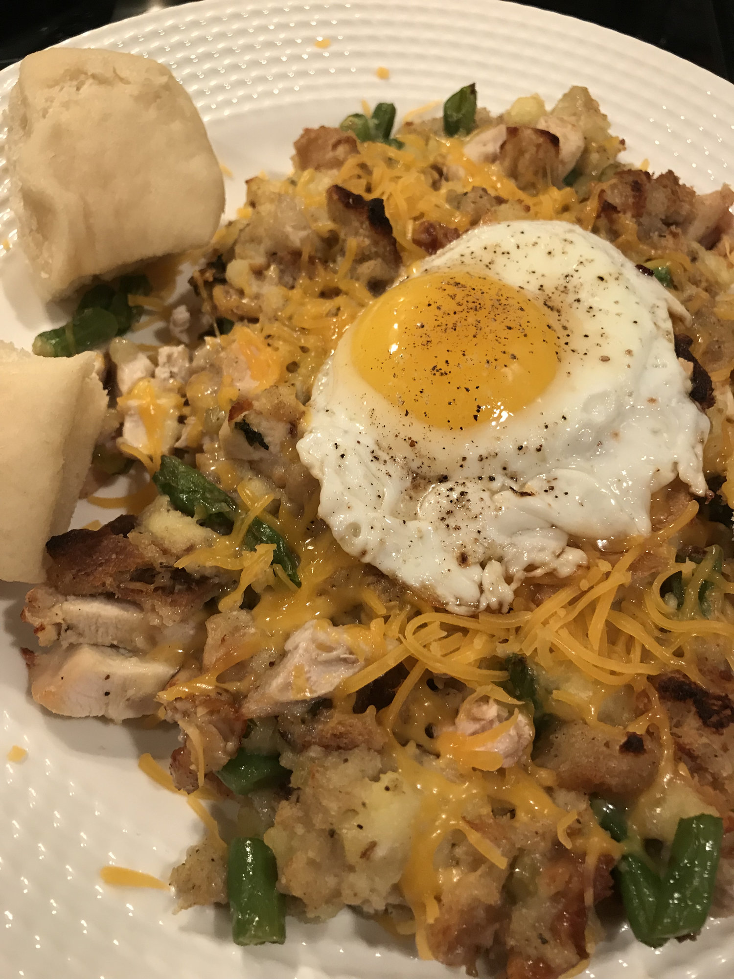 I know I’m late to enter but this was simple and awesome. Mixed up turkey, stuffing, mashed potatoes, and green beans and baked until warm in a skillet. Then broiled it until crispy, and topped with cheddar and a bacon-fat-fried egg