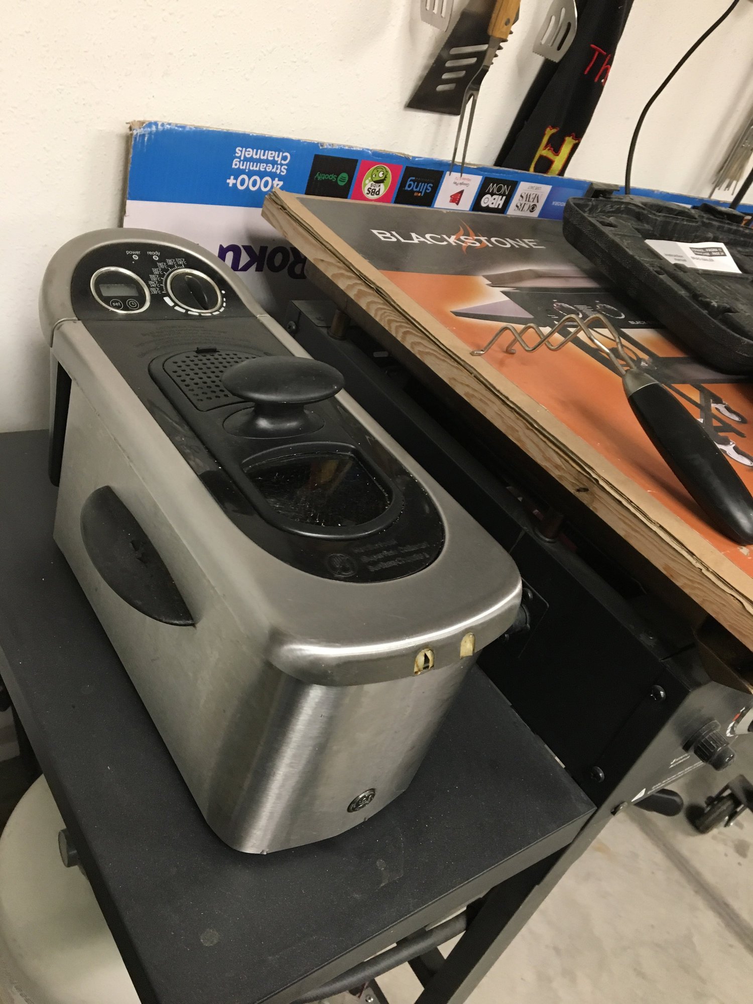 I went away from a countertop electric fryer and now use an induction burner with a cast iron dutch oven on it. A wire mesh spatter guard is helpful. The induction burner means no worries if I get a spill-over.LBGE/Weber Kettle/Blackstone 36" Griddle/Turkey Fryer/Induction Burner/Royal Gourmet 24" Griddle/Cuisinart Twin Oaks/Pit Boss Tabletop pellet smoker/Instant Pot