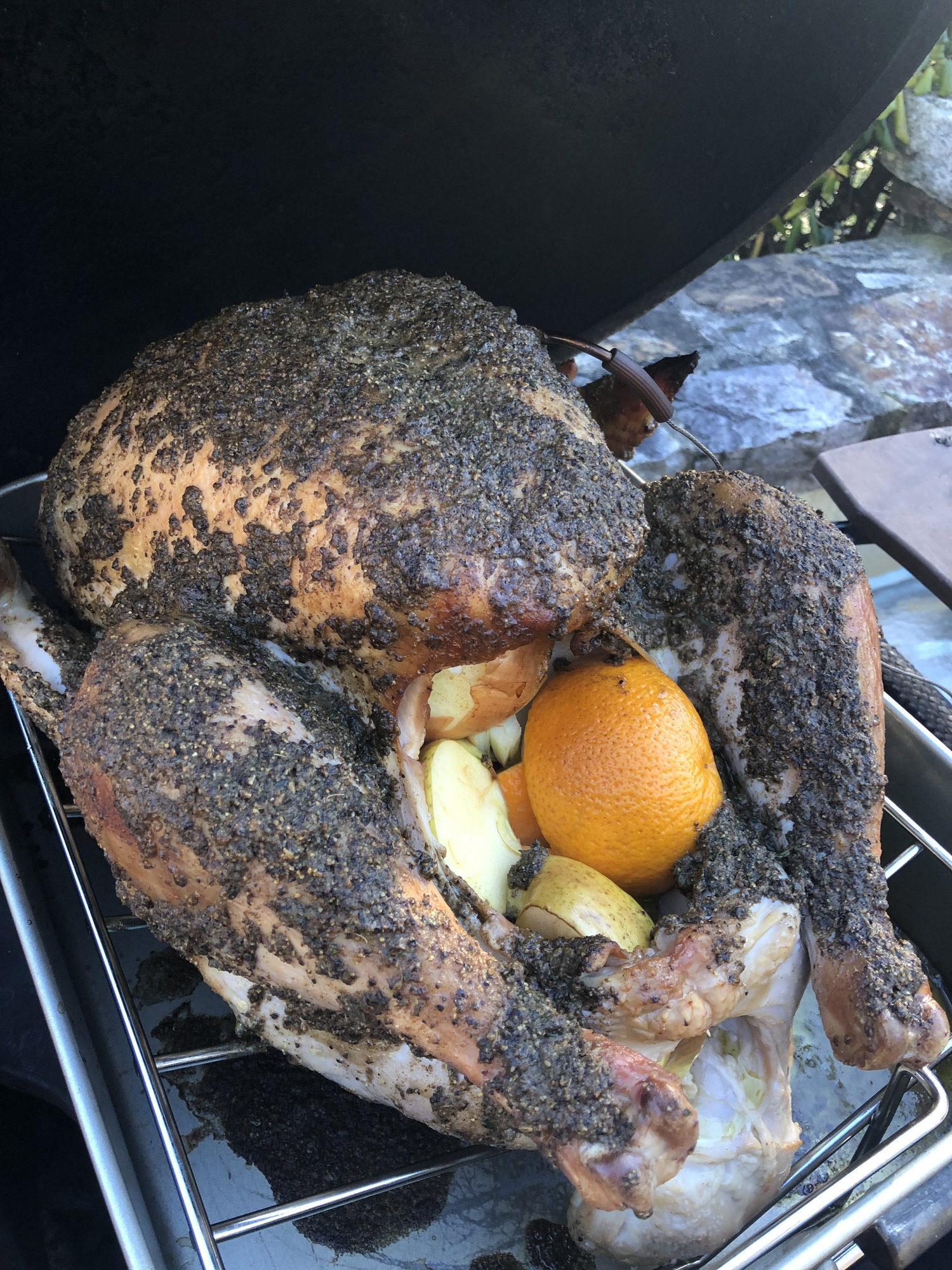 • Indirect. Modified Mad Max18 lb brined bird. Close to 4 hours to 165 deep in the breast. Compound herb butter hid a very red skin — 2 lumps of cherry did that.