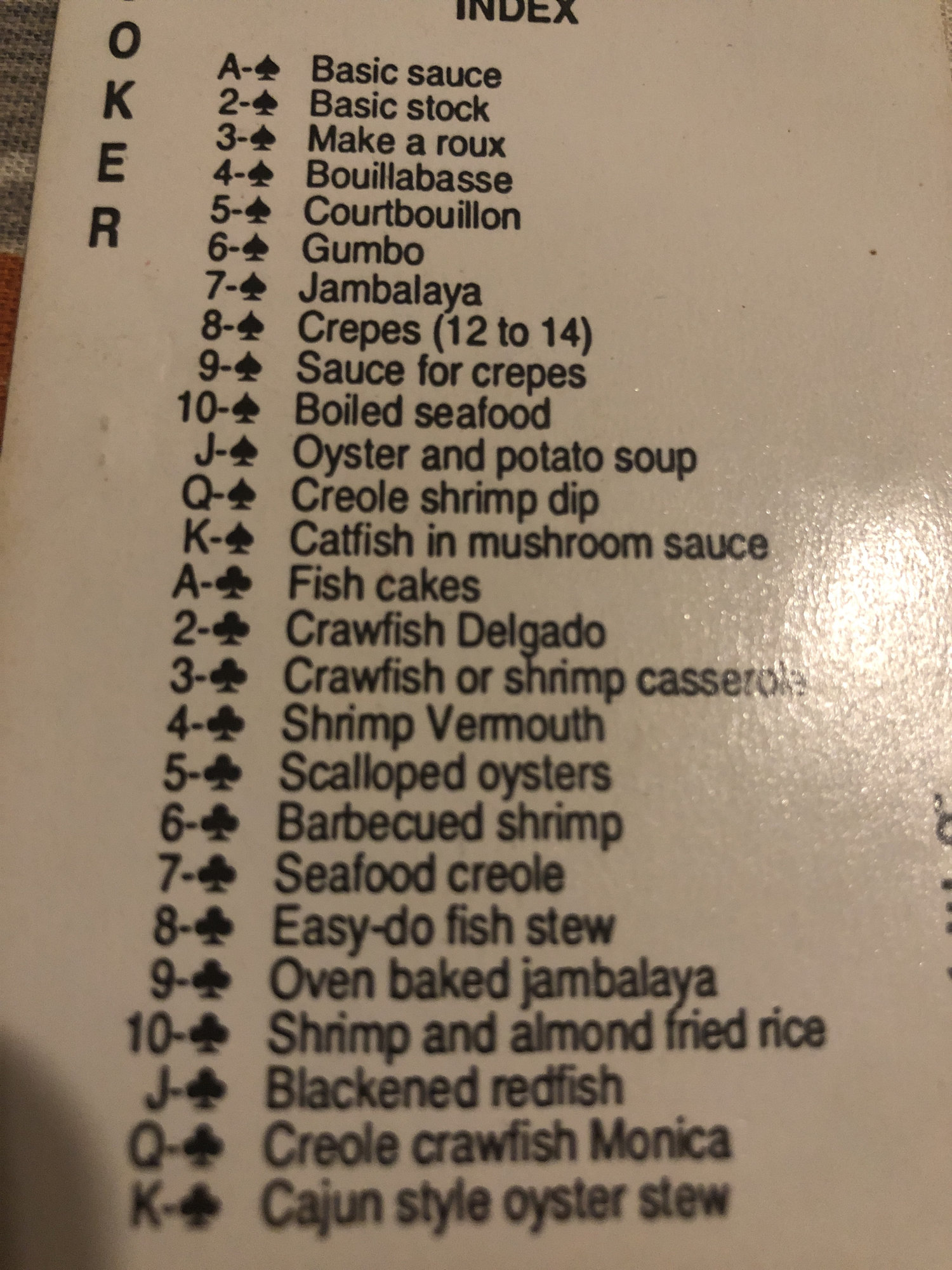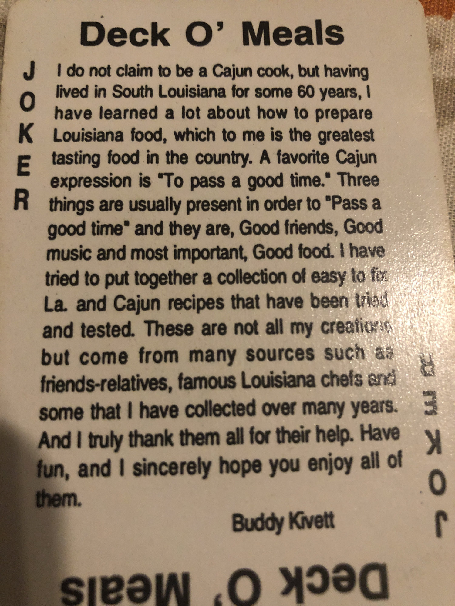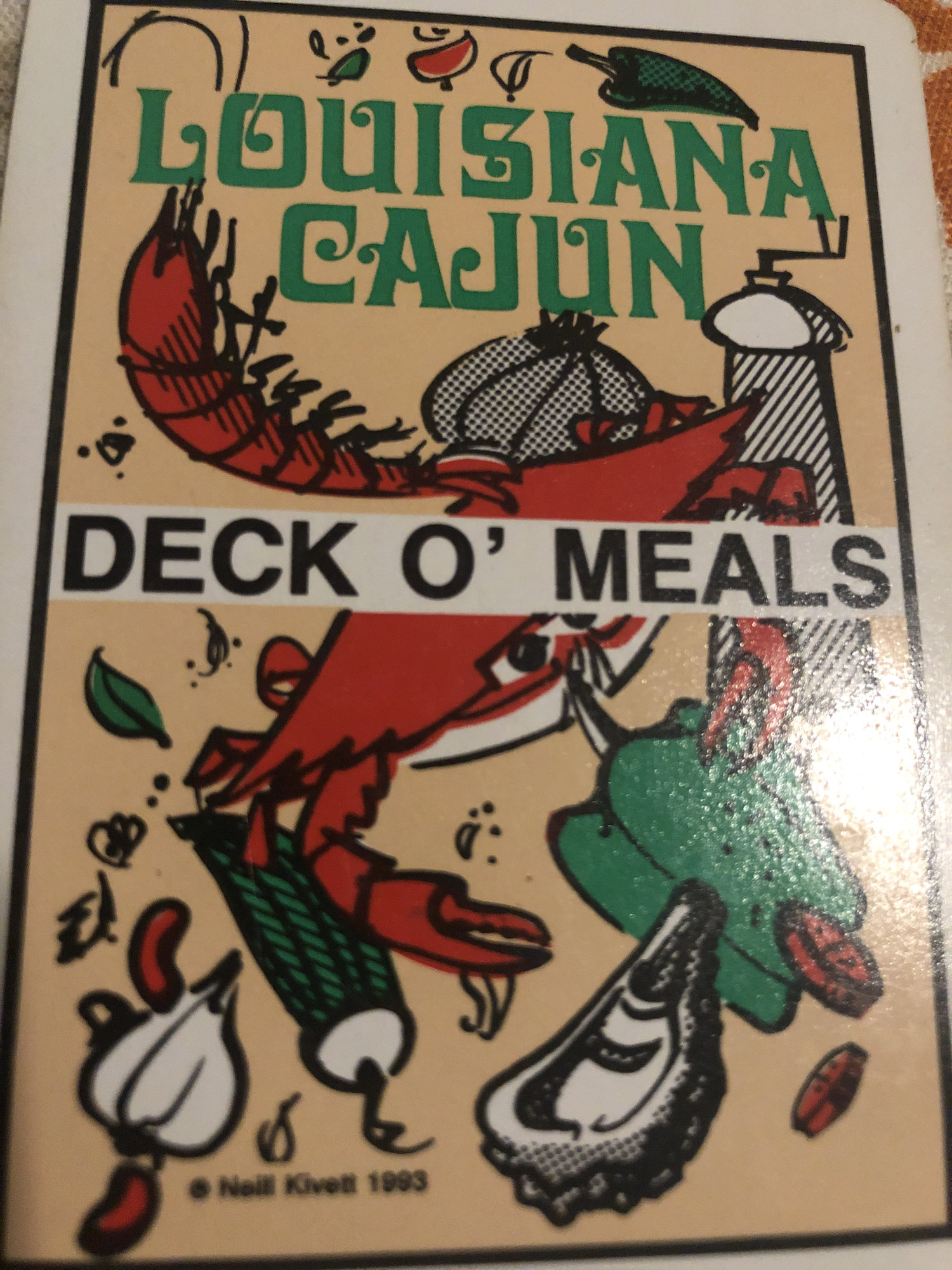 This card is from a deck of cards all with different Cajun recipes.   I bought it at a place called Cajun Charlie’s in Sulpher, LA.