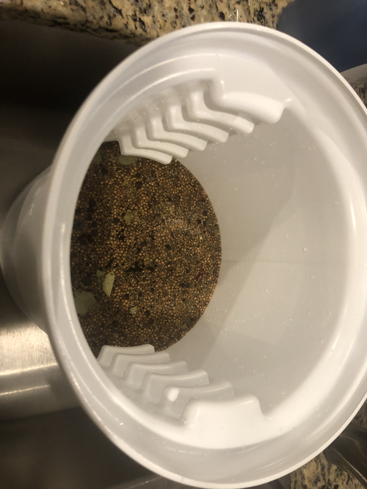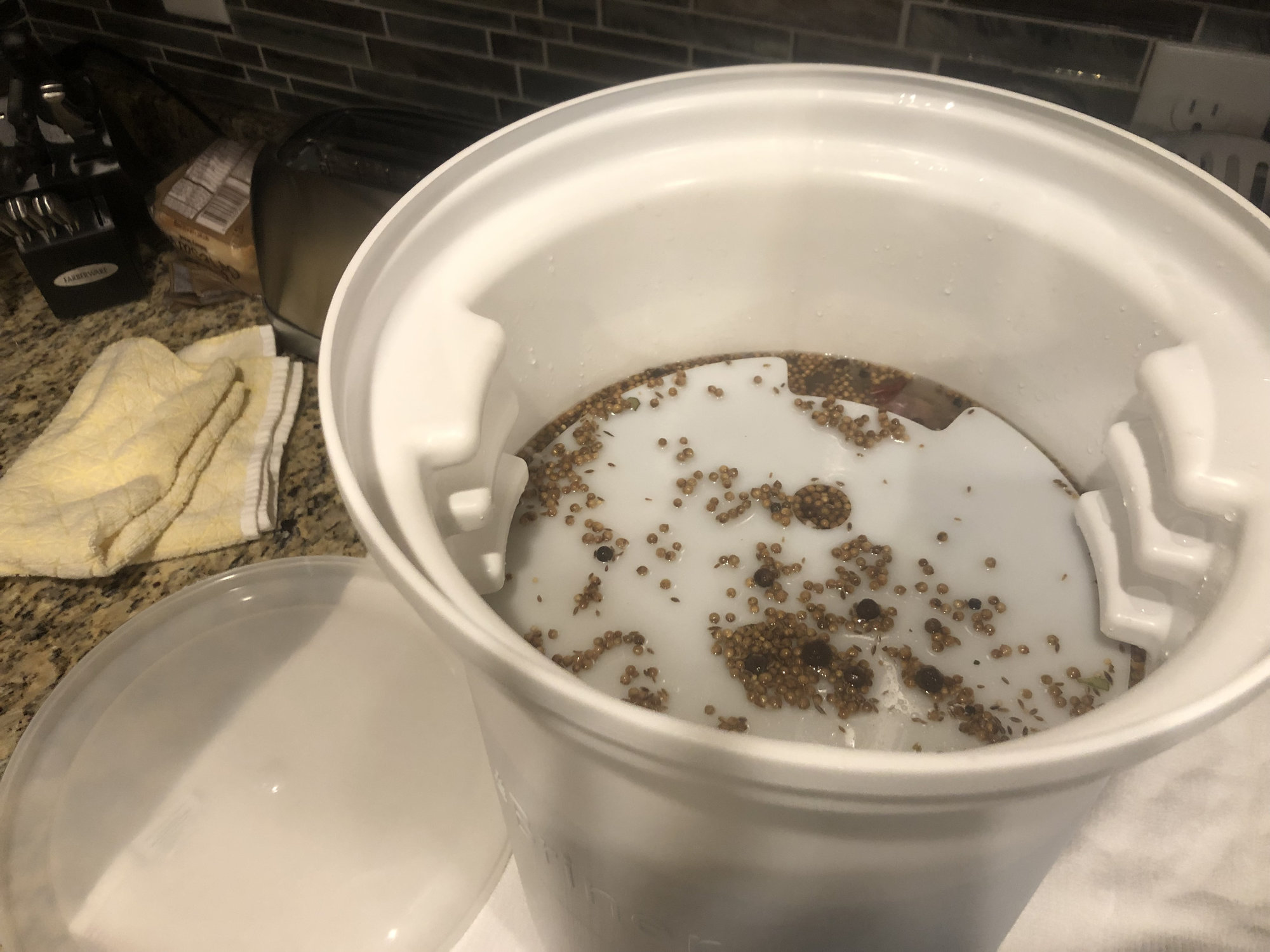 Started off washing out the dusty Briner bucket (Large) I use for turkey.  Added two gallons of water, to get the ribs fully submerged, and pickling spices.  Next the ribs went down for a 7 day soak.