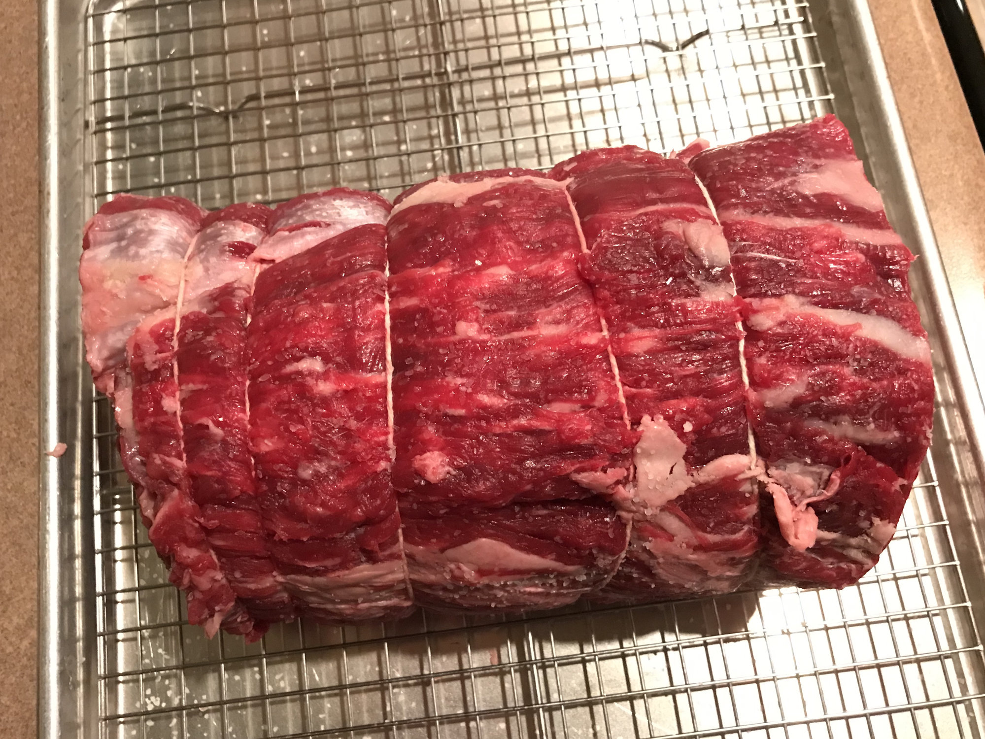 Bones pulled off for beef stock, tail and fat cap trimmed off and tied up to keep round, currently dry-brining in the meat fridge.