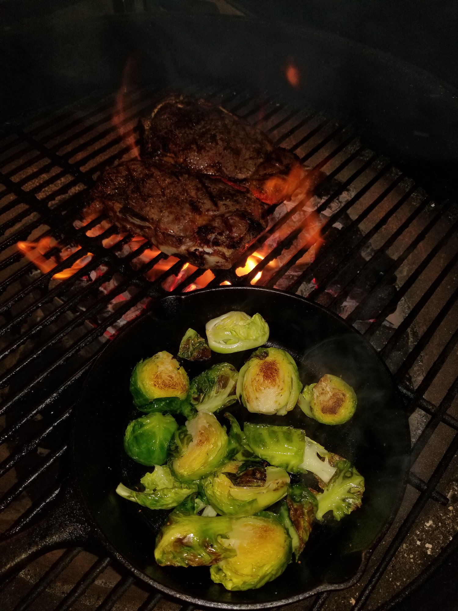 Nothing exciting, a couple of bone in strips with sprouts. I rubbed the steaks with Trader Joe's BBQ rub, on the sprouts I used EVOO and garlic salt. Thanks for looking...