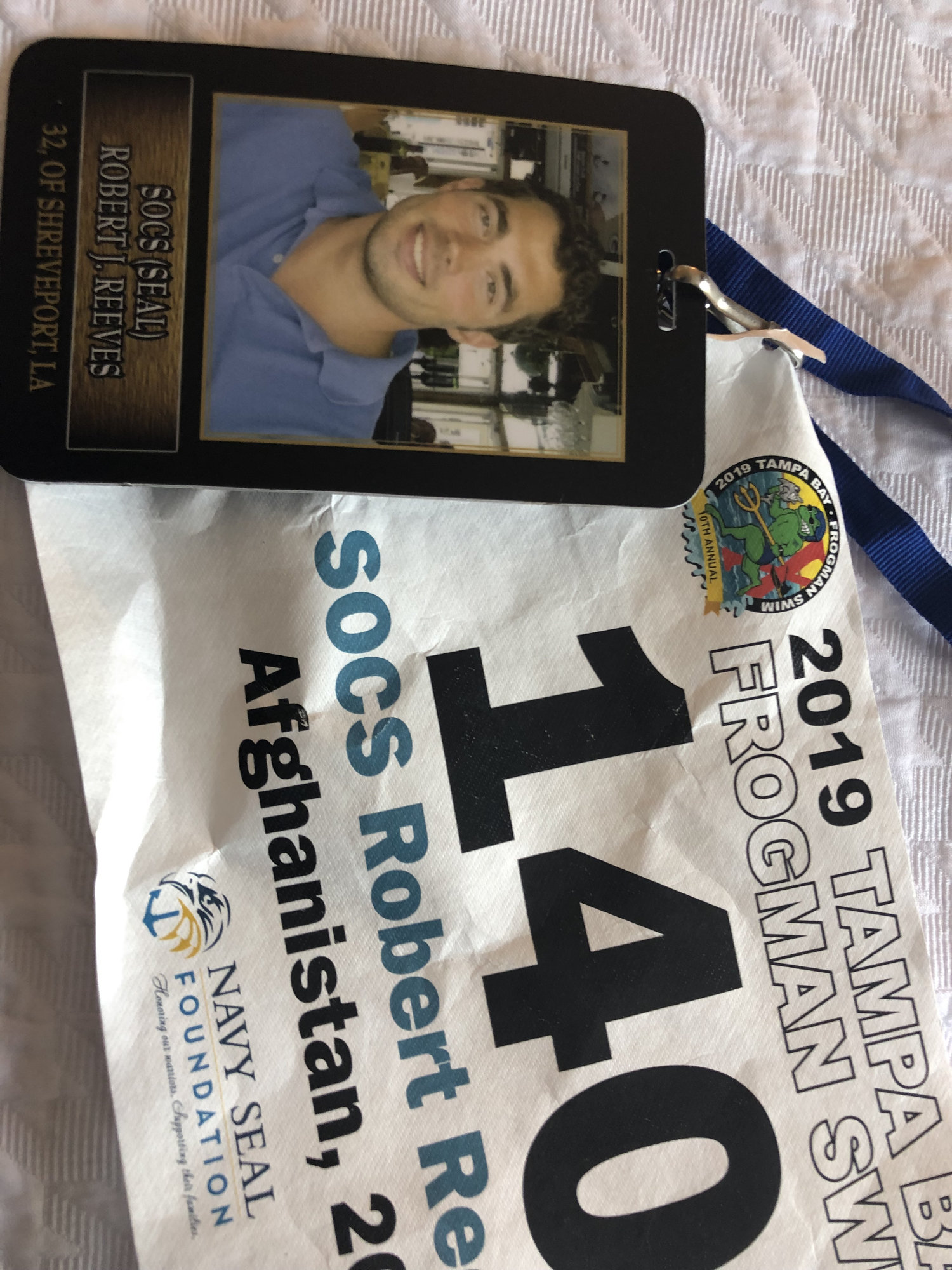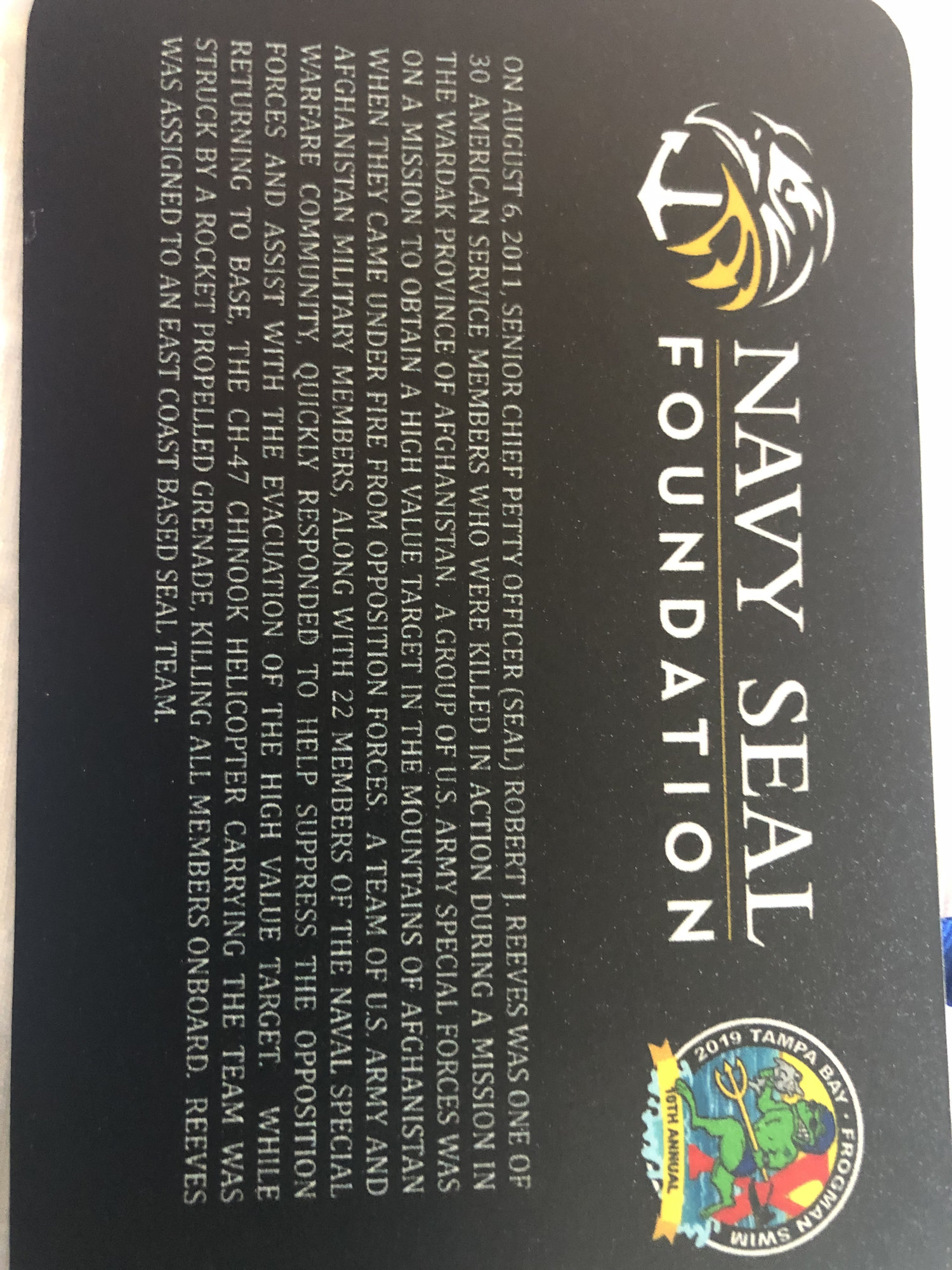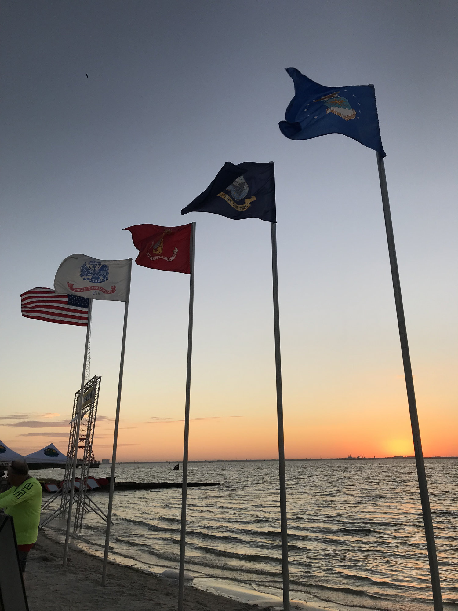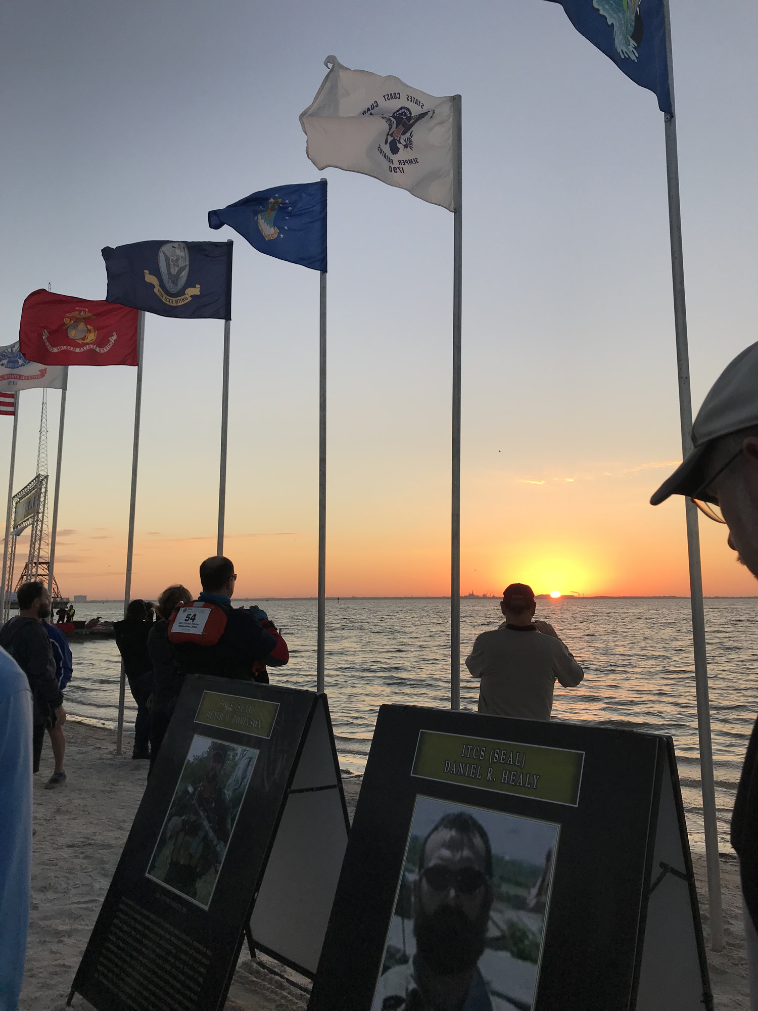 We had a happy hour/dinner where I met the son's wife, and she shared similar stories about her husband as well as all the fellow SEALs wives and girlfriends and all the Army, Marine, and Air Force bad ass gold star wives she's met since her husband passed away.I met a handful of other gold star families, and they had a strong presence at the event.The morning of the swim was another one filled with plenty of emotion, but also a strong appreciation and recognition for the type of people that stand up and put their lives on the line in the name of our Country.They had a presentation of colors from a local HS JROTC team, followed by the singing of the Nation anthem as the sun started to rise over the Bay.A Navy LT then read the names of Marine, AF, and Army special operators that lost their lives over the last year. Although it was a shorter list than previous years, it was still humbling to hear the long list of young lives lost in the defense of our Country. They LT then read the list of names of Navy Special warfare members lost since September 11, 2001. This reading went on for over 10 minutes and was over five pages long. While they only read their names, each name carried with it a story of service, sacrifice, dedication, and heroism.All 175 of us then headed out in 7 waves of 18-28 people. The 2nd wave was filled with friends and family members of fallen SEALs as well the highest ranking SEAL in history ADM(R) Eric Olsen.I was in the final wave, but wasn't the final one out of the water. My 1:56 in the water really didn't mean a whole lot other than trying to not drink the entire bay and just keep moving. I'll save those details for later. As I exited the water, ADM(R) Olsen was just ahead of me, and it was pretty humbling to see him at that time. I had one of the USNA grads (Rugby player, SEAL and Ranger school grad) that I met at previous events greet me, and as I got out of the water, hand me a Budweiser and said, "I told you I 'd have one of these waiting for you, brother!" Then Patrick's Dad, CAPT (R) Feeks handed me the Navy SEAL Foundation Tampa Bay Frogman Finishers coin. They had Gold Star families thanking us and each swimmer was greeted and handed a coin by one of them.We had a great after party and are still waiting for final numbers on the total raised over the last several months.While I went in wondering how fast I could make it across and where I would stand vs. the other participants, I left realizing the whole weekend wasn't about the swim at all.This event was more about honoring the service of the SEALs we lost in defense of our Nation while raising funds to take care of the families they left behind and the SEALs still serving and those who will serve in the future.Never Leave a Man Behind.Thank you all who contributed and who continue to support our Veterans of all services.=======================================
