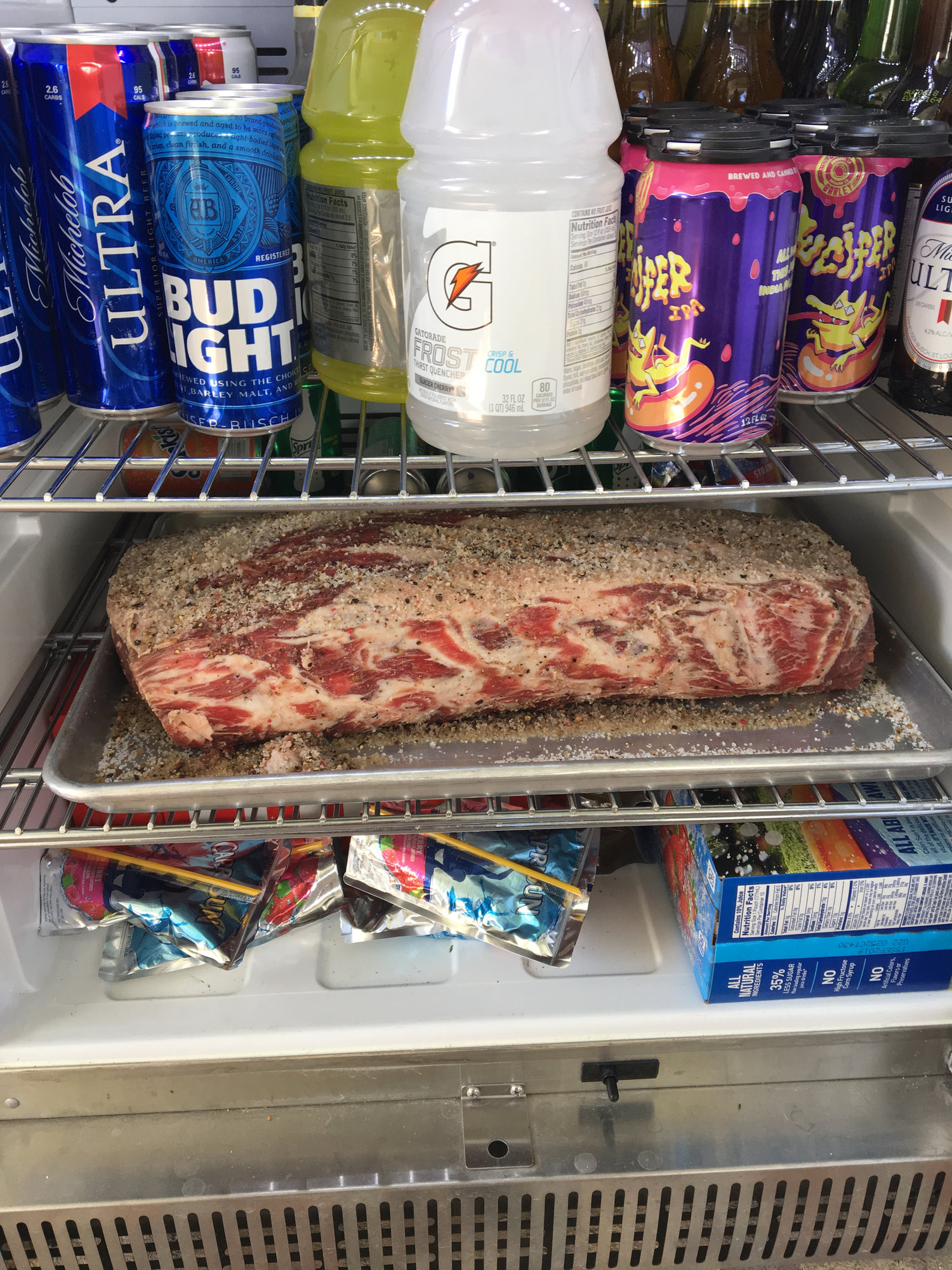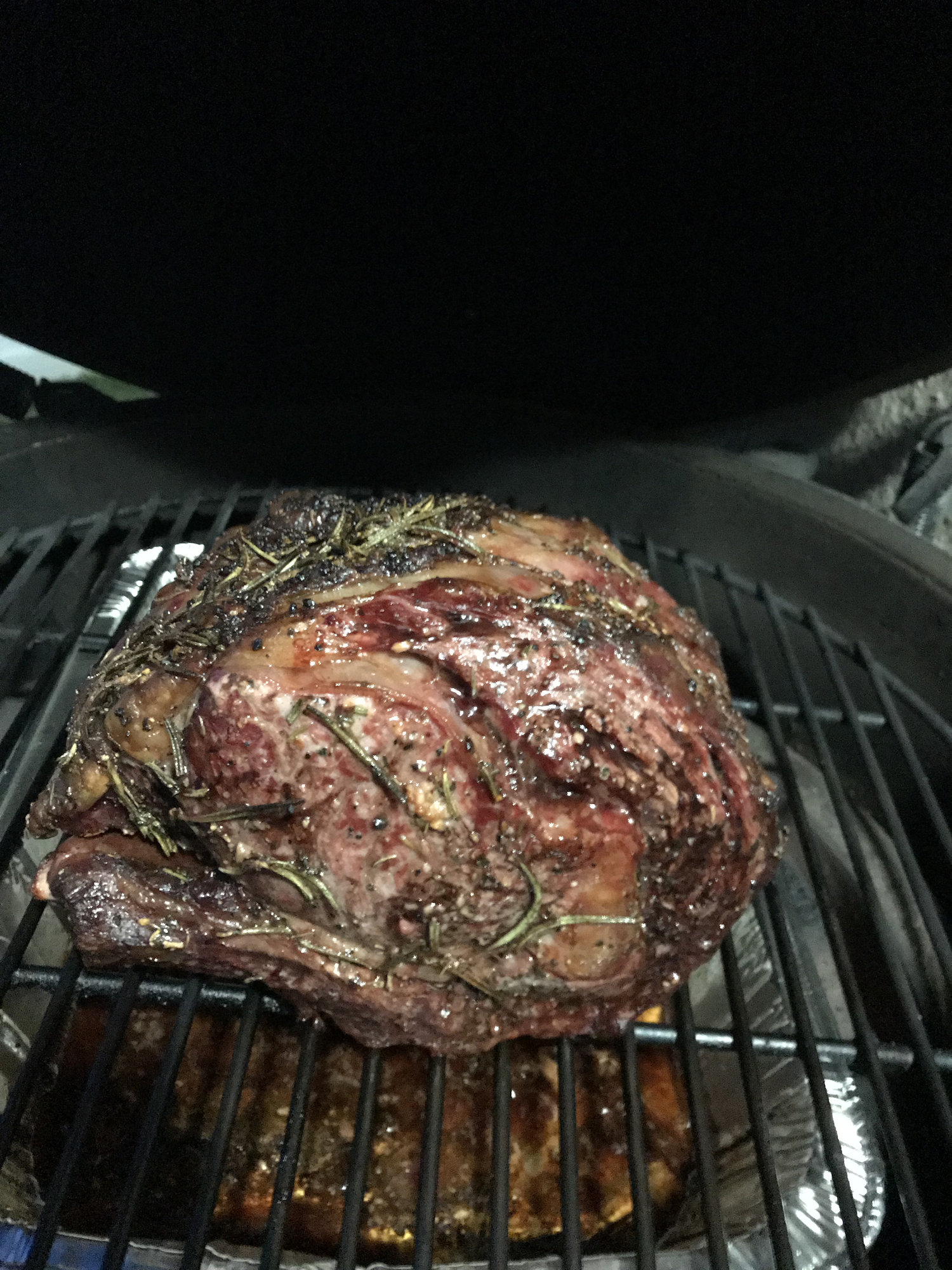 I remove the bones and smoke separately for some great beef back ribs. Try and get the now boneless roast as round as I can-fresh ground pepper, salt the day before and fresh rosemary. Garlic is a game-time decision. As noted, this is about the easiest cook there is if you run L&S to the finish. FWIW-