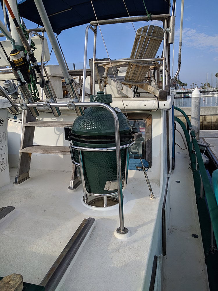 Awesome setup you have there!  I thought it was nice having my egg on my patio by the beach in Newport but on a boat in its own holder is a step above.  The wind is brutal down here today!