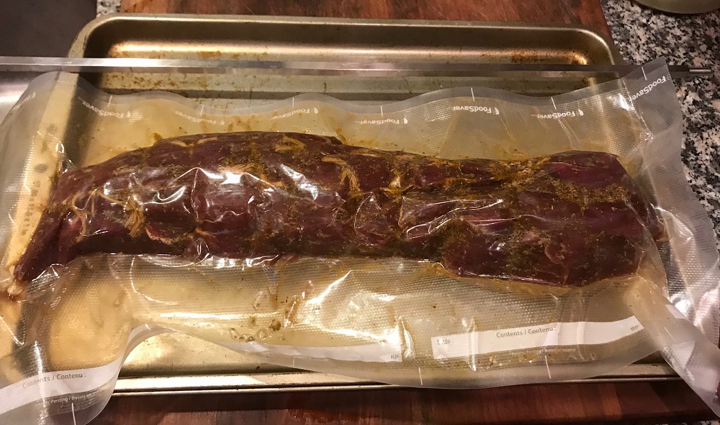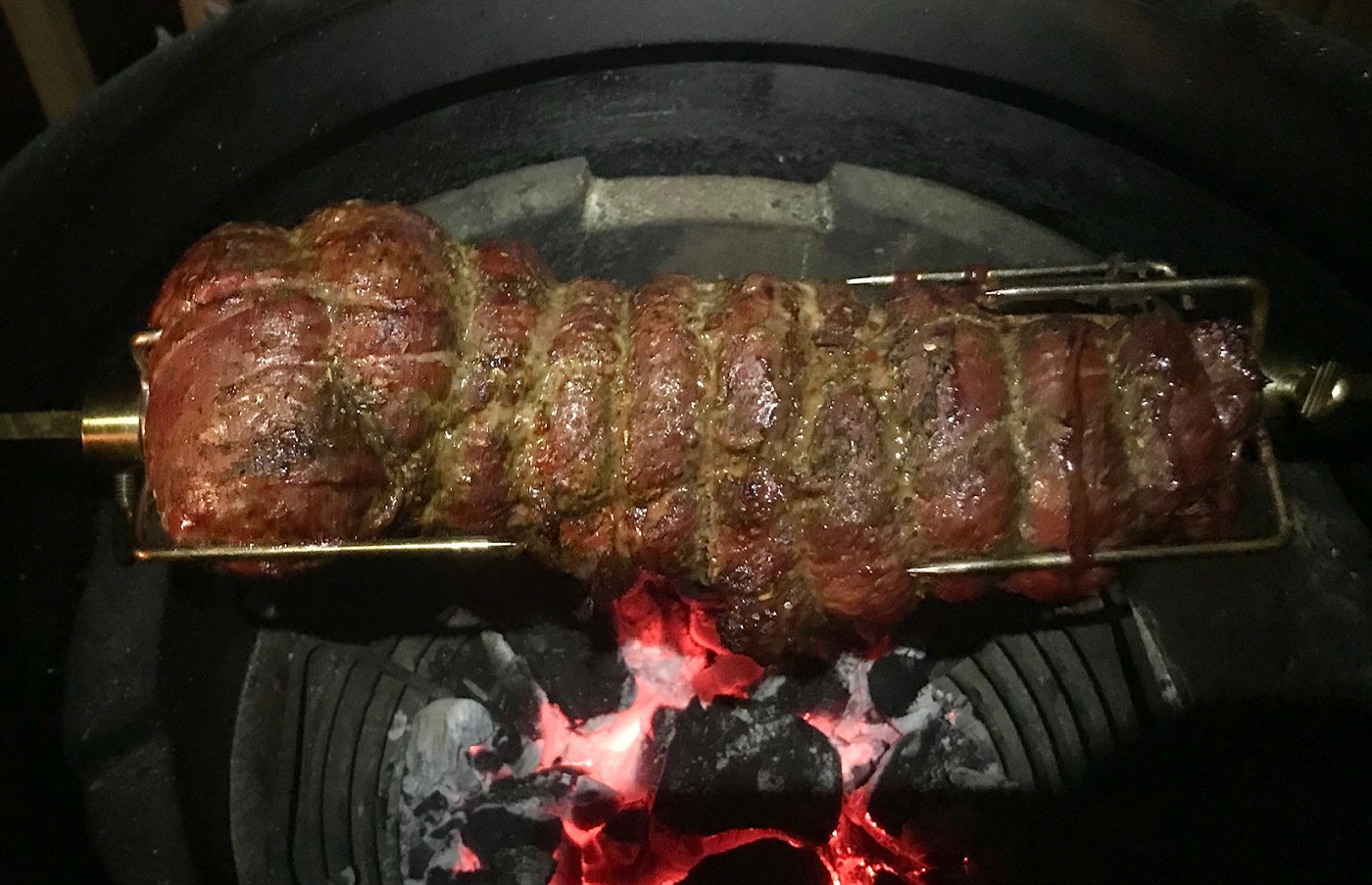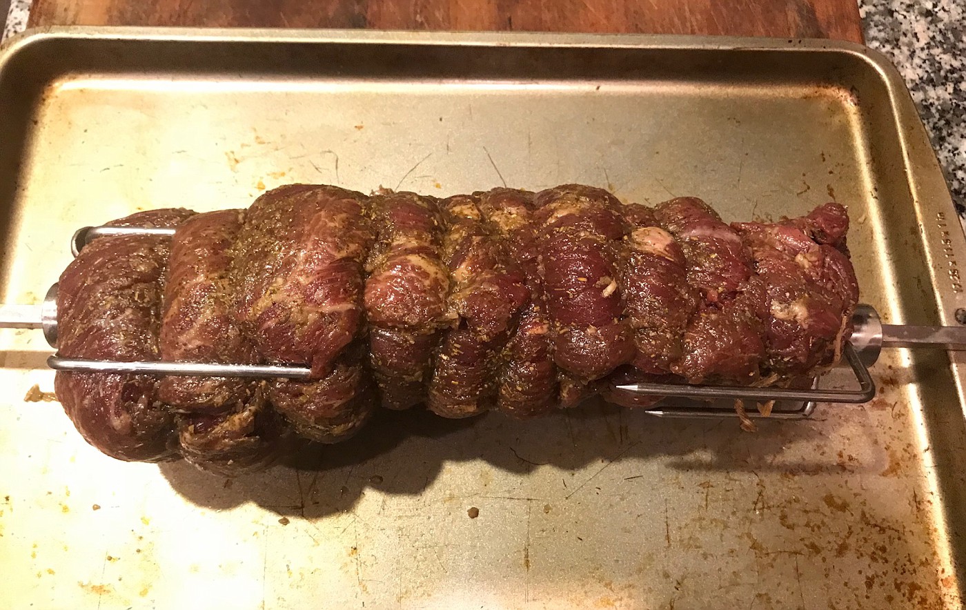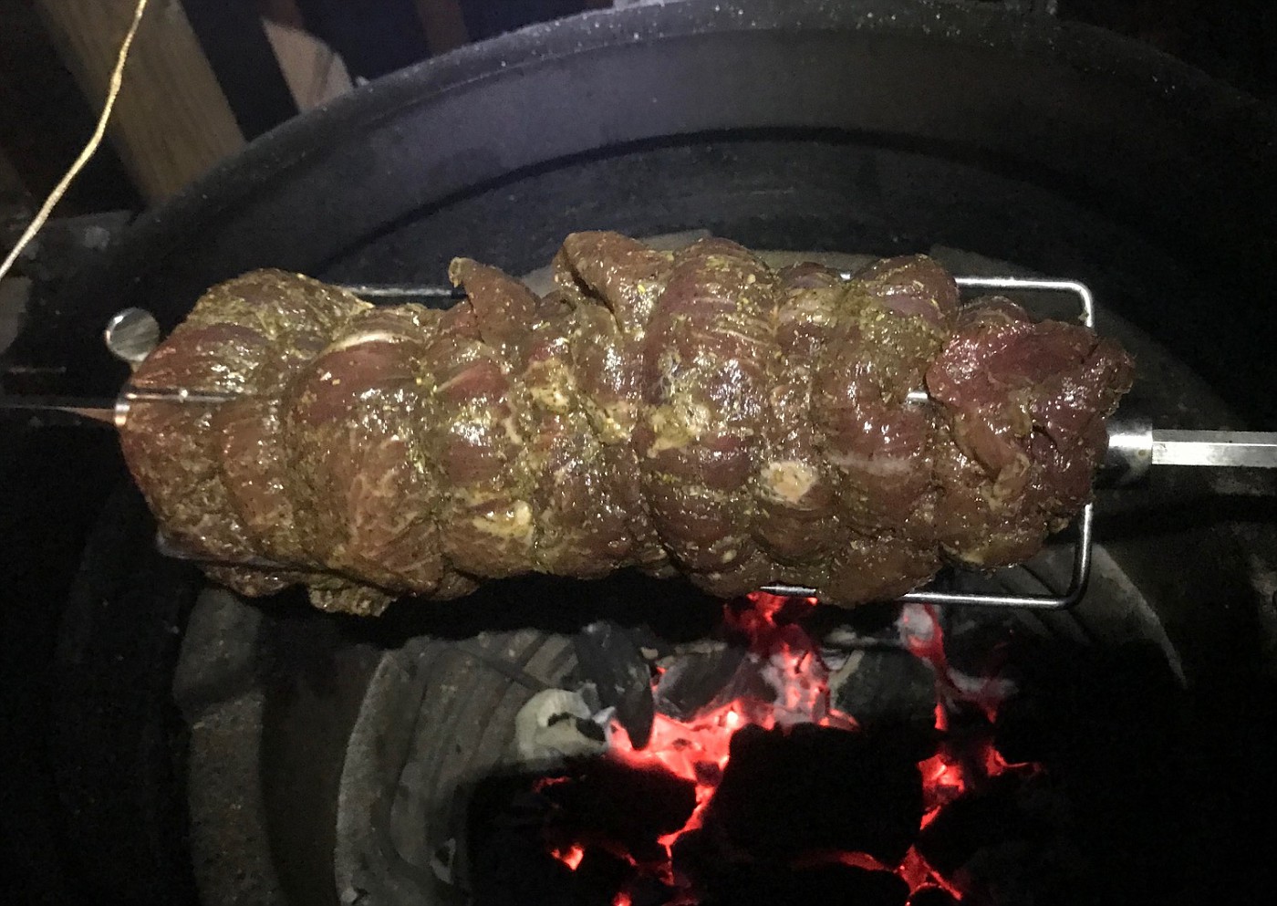 This was a whole tenderloin that I had the butcher clean and tie. I ended up putting a few more ties on it so pieces didn't flop down while it was rotating;