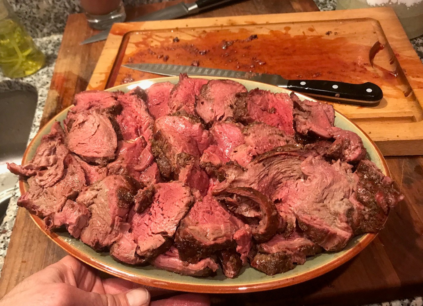 And, carved for service. Lot of choices in here for everyone. Mostly MR, but also some Rare, Medium, and some MW on the ends. It was very good. I put a little wood on the grill this time (Apple and Peach). I like it better without any smoke, though.