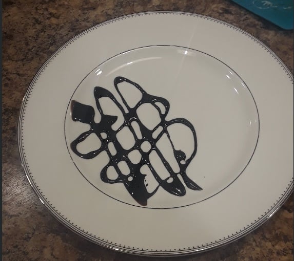 Here's how I put the balsamic onto the plate. About 3/4 cup balsamic vinegar reduces down to about the right amount for 2-3 plates: