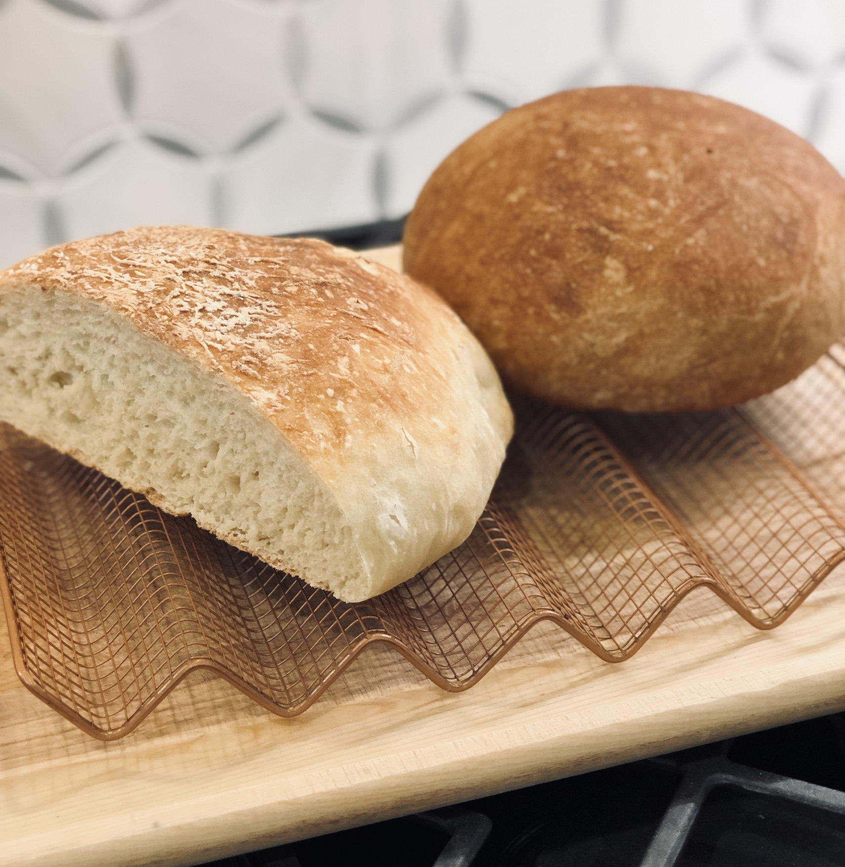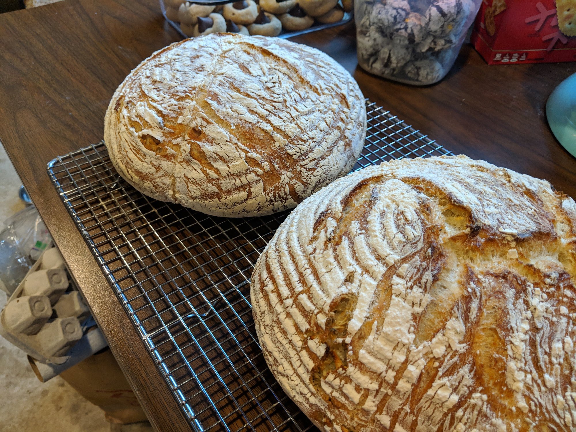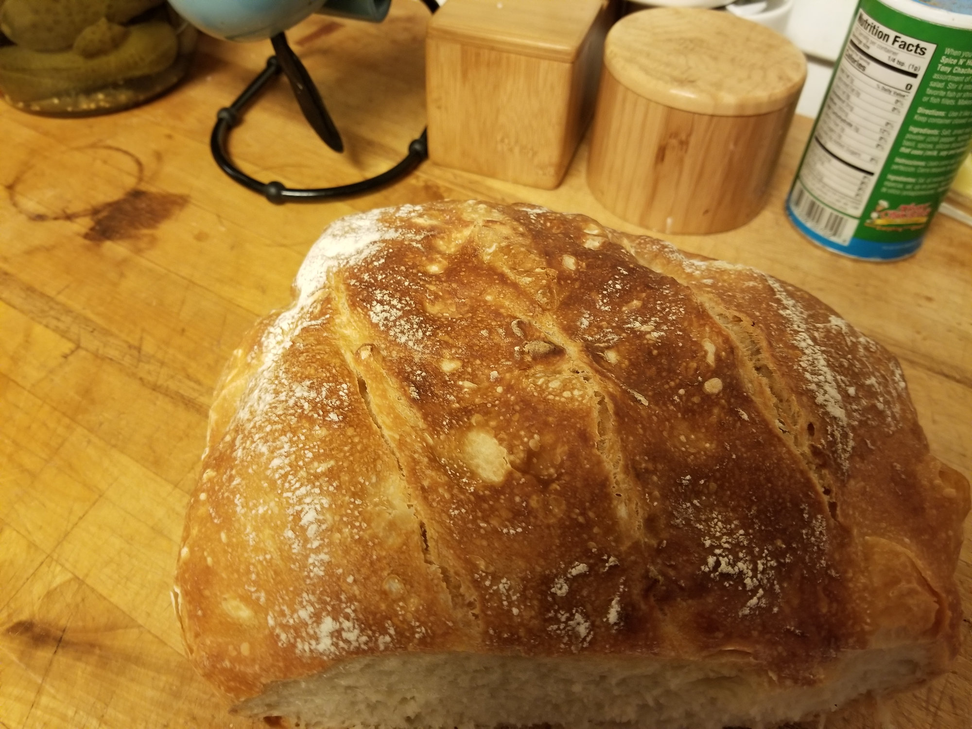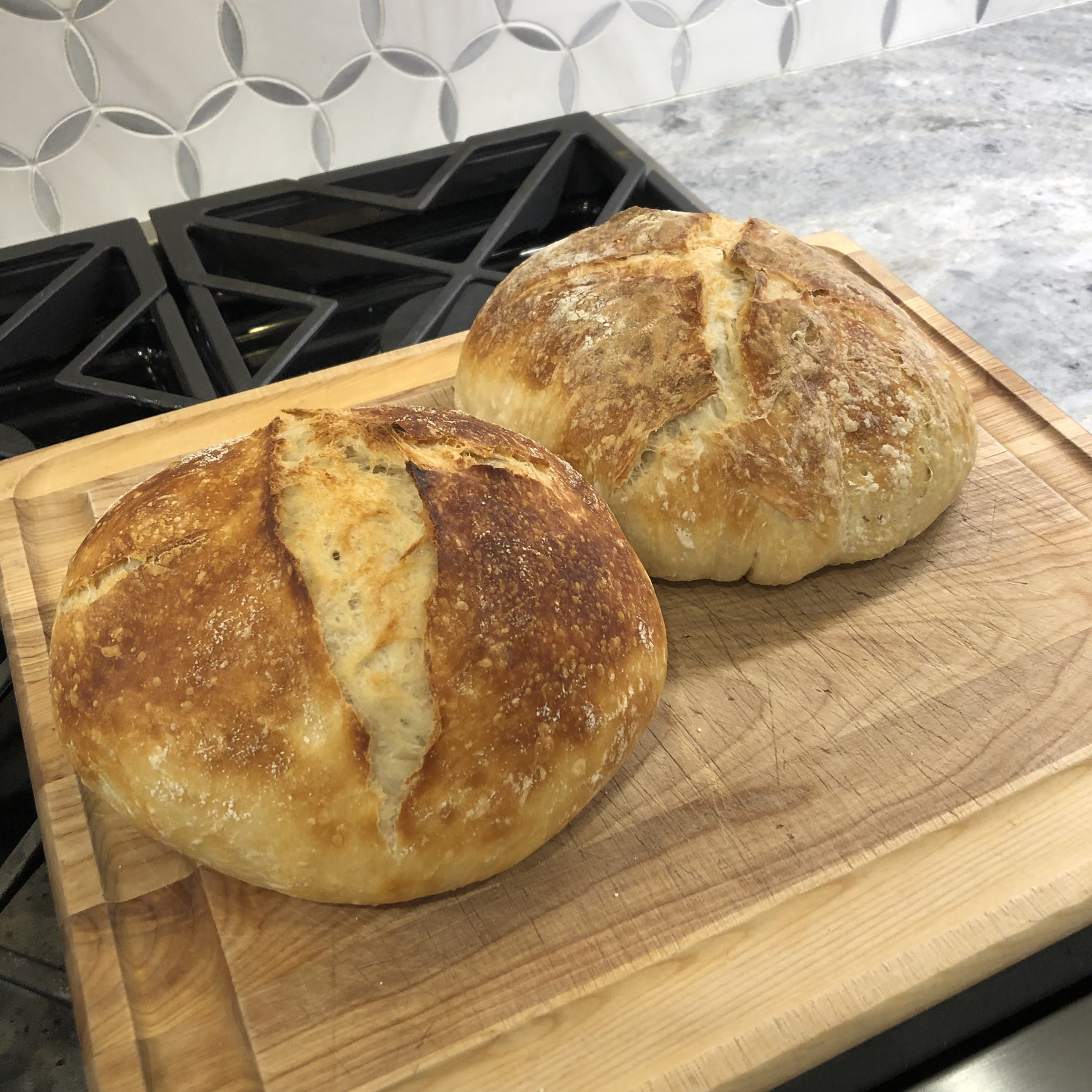 Did two more, one in front is all purpose King Arthur flour with slightly more water than I had used previously (still came out great, but the loaf is kinda flat as you see), and the other in back is King Arthur whole wheat flour.