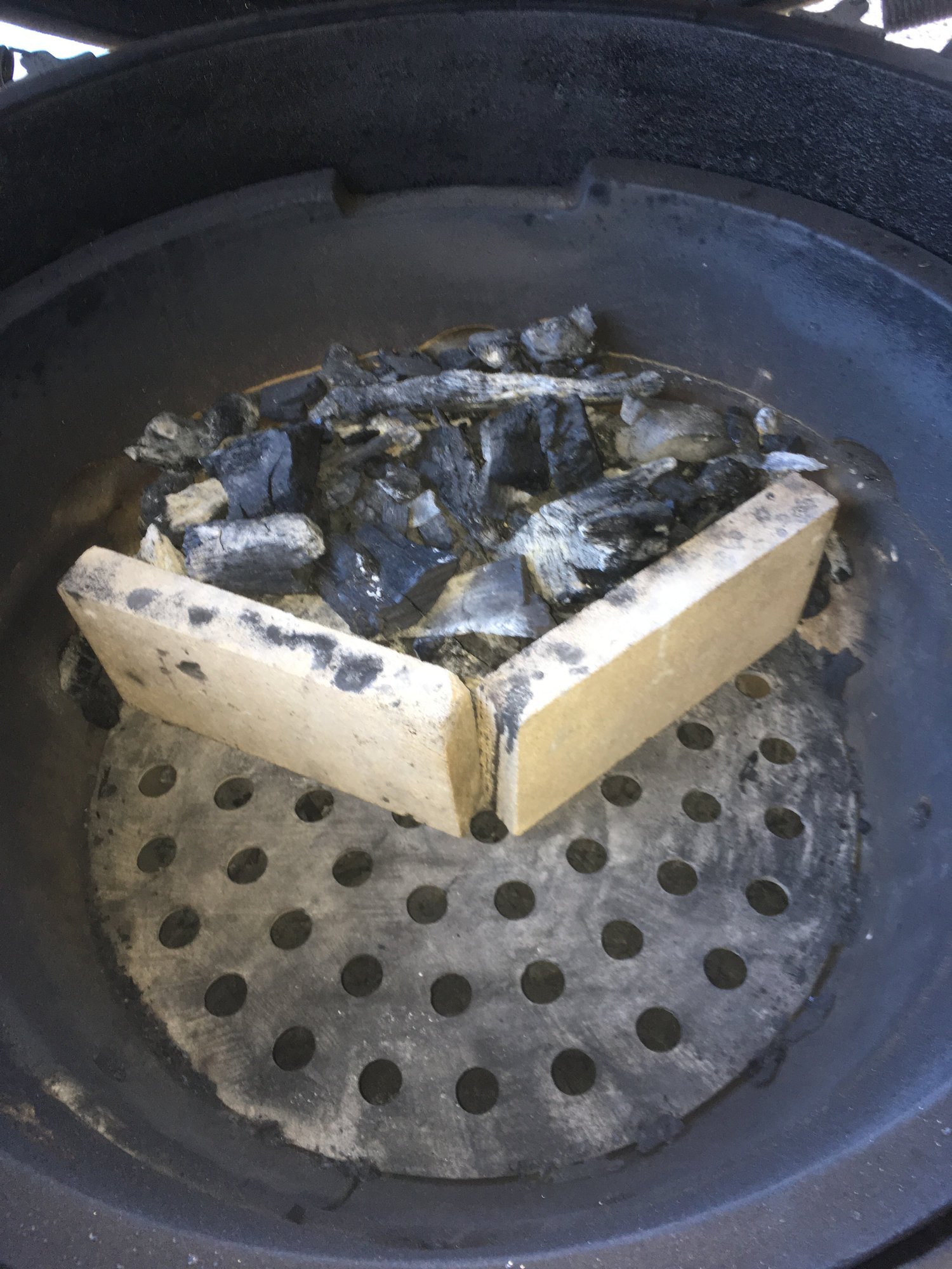 2 fire bricks on the fire grate in a "V" configuration. The V can be spread narrower or wider. Stack and lite the lump on the backside (hinge) leaving the front side open. This creates an indirect side and a direct side of the grid. Move food front to back as needed. No need to purchase those expensive stainless steel "L" bracket things sold online.
