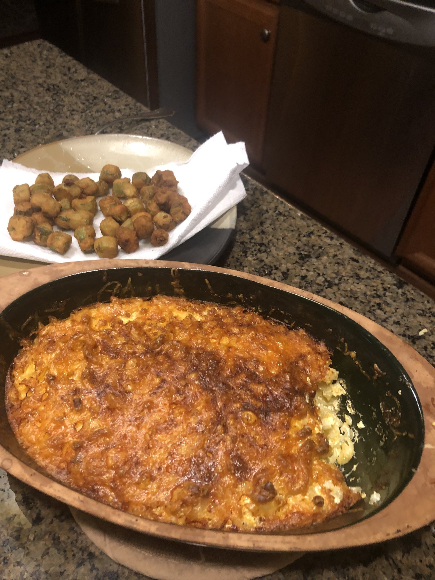 Wooped up a little macoronni....and some fried okra. Oh yeah, and grilled pineapple chunks with some DP Pineapple Head.