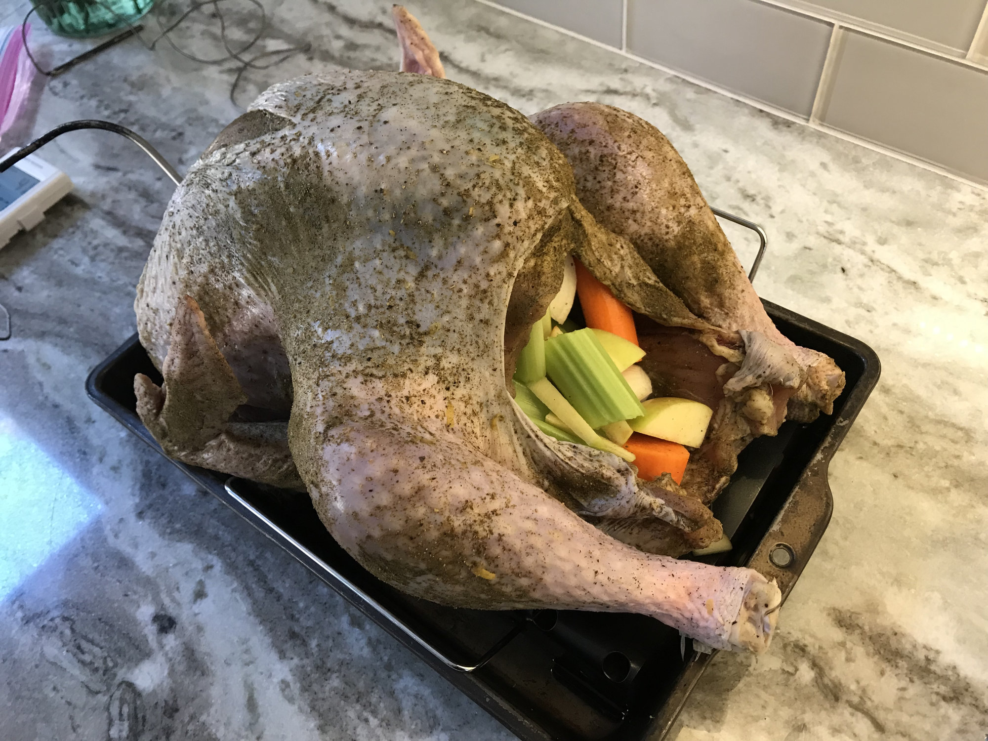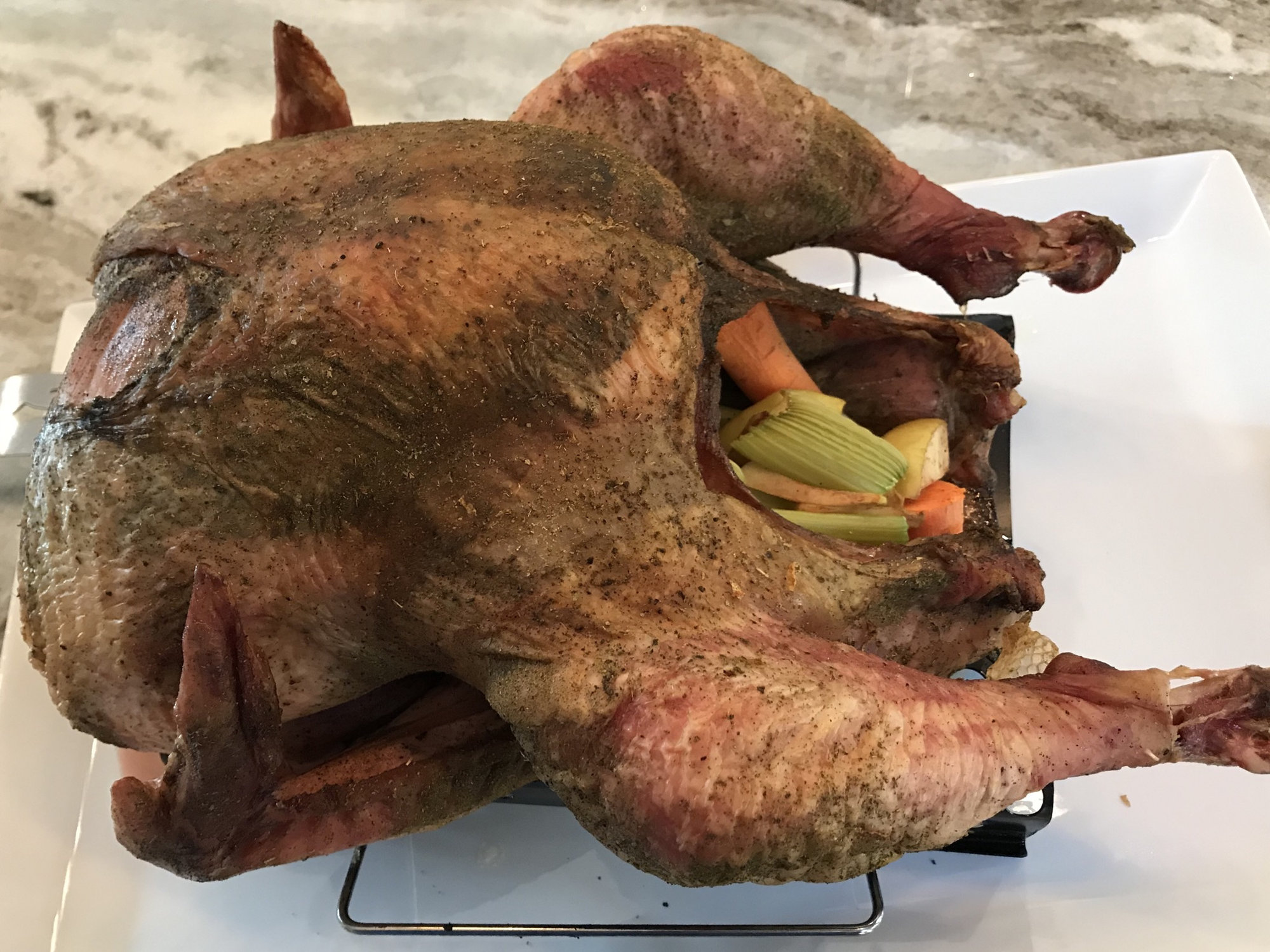 First was turkey leg stock roasted for the the gravy. Worth the the effort to puddle in Mrs. 500’s mashed taters. Then I ordered 12# organic from Whole Foods. Dry brined with kosher salt, lemon zest, and crushed rosemary, sage, thyme, and day leaves. Dry brined for 18 hours. Indirect at 350* with a handful of cherry and pecan. Smoke roasted for 2 hours 40 minutes. Rested for 20 minutes. Done this way there was very little drippings in the pan. First time dry brining. Will do again.