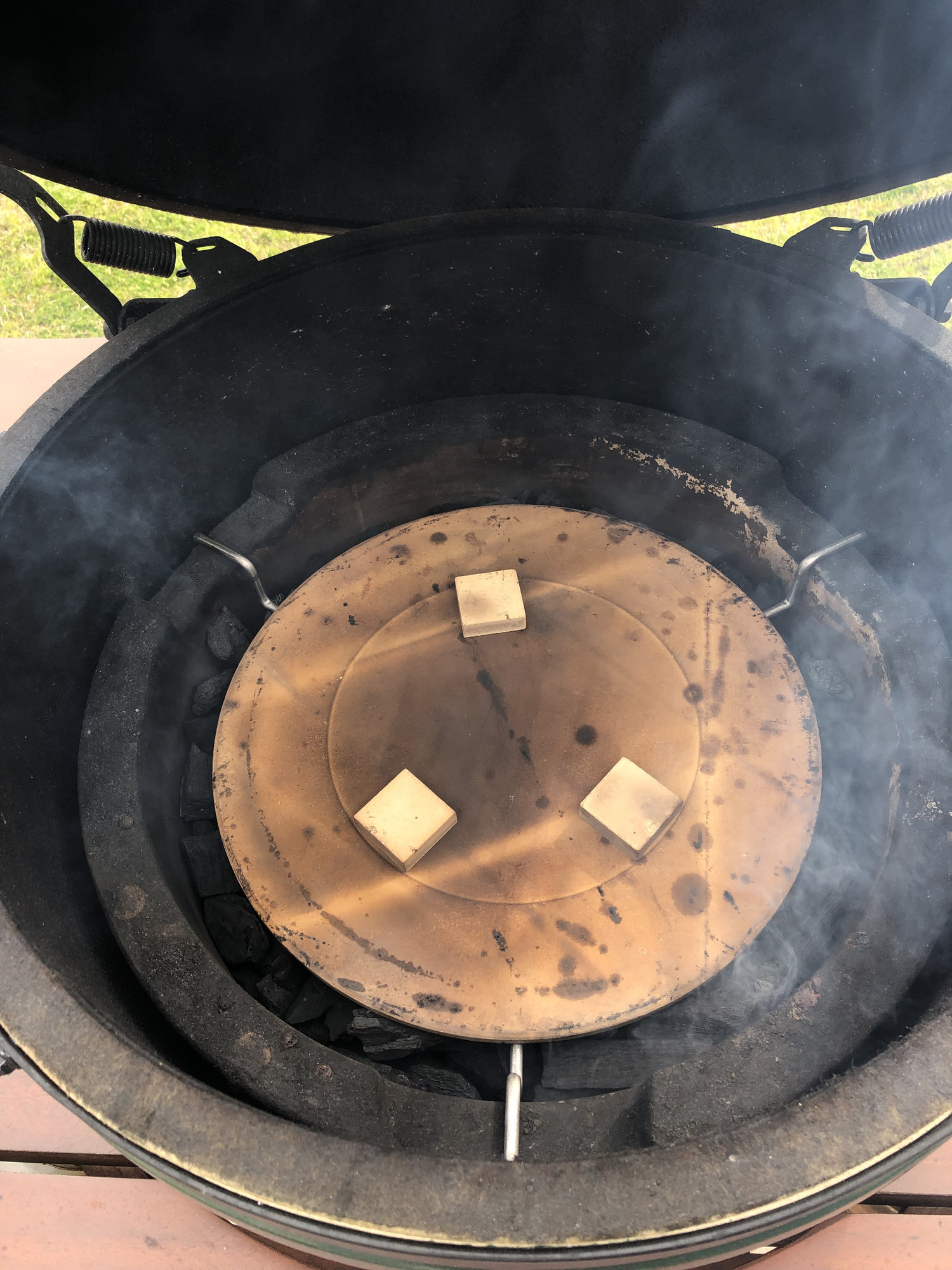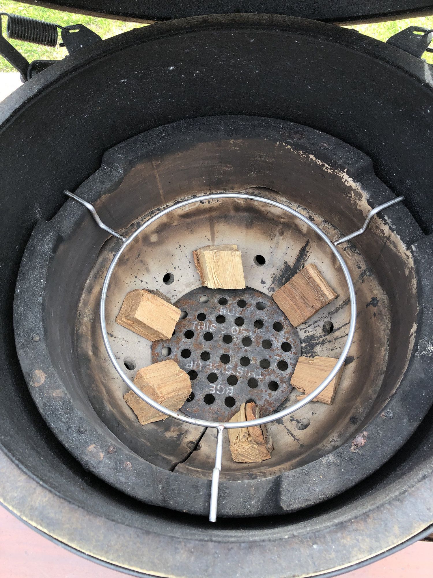 I did think about the fat drippings after some research on here. Hoping that at 250 degrees it won’t cause much of a problem. I’ll be up enjoying adult beverages all night so a quick reload shouldn’t be a problem if it comes to that. By the way, that’s not a wood ring. It’s a spider under an eggspander. @tarheelmatt will appreciate this. This is what we talked about in your YouTube comments a while back.  All is well so far. Two butts and six shoulders on the way.
