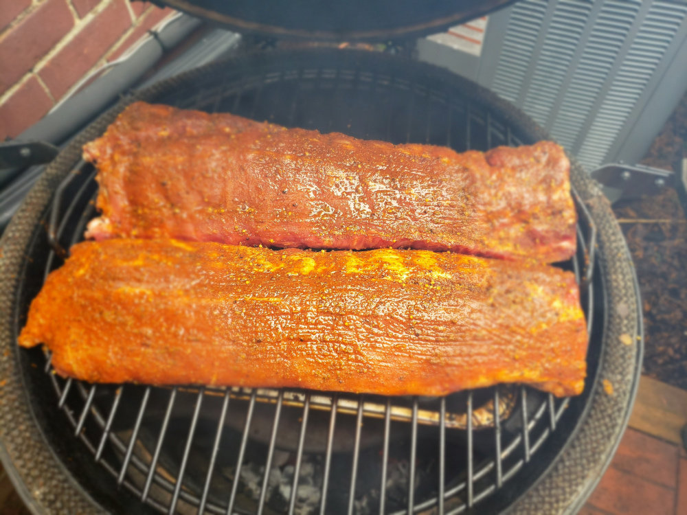 Basically, you dry-brine the ribs, then coat in the rub (recipe is a link in the link above). Then you throw them on the Egg at 350 for 1 hour and 40 minutes, or so, mopping occasionally with a mixture of water, white vinegar, same rub, and a little bit of barbecue sauce or ketchup. (I use barbecue sauce.). Apart from the mop, the ribs are not sauced. A sprinkle of rub goes on the end.