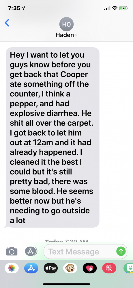We stayed out on the boat last night and received this text from my 20 yo son. Happy father’s day! (Dog is fine, carpet...not so much)