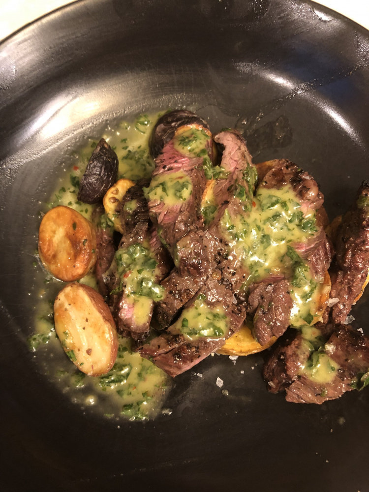 Grass fed skirt with chimichurri and oven roasted fingerling potatoes