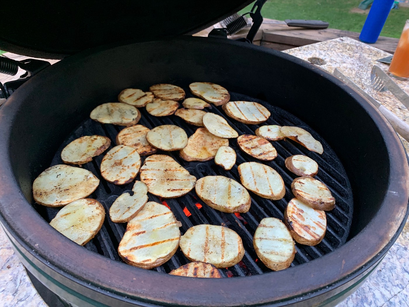 Anyway, needed a starch as well, so I threw on some thick slices of russet with olive oil and Meat Church BBQ seasoning to give them some flavor.