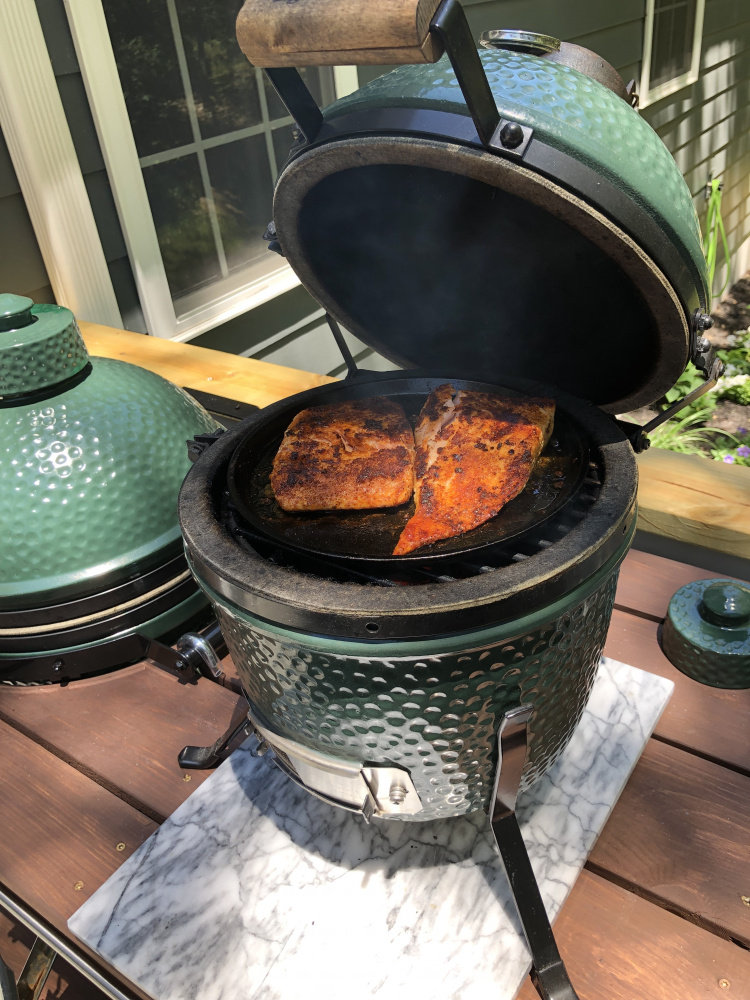 Beautiful! I did blackened salmon yesterday. One of my favorite cooks! I use a 9” Lodge handle less griddle that I picked up at their factory outlet. It fits perfectly on the Mini.
