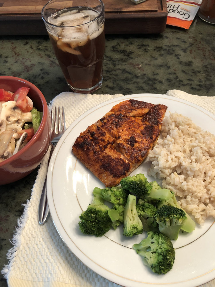 My son went off to summer camp for the week so I cooked him Salmon and Steak which are two of his favorites.