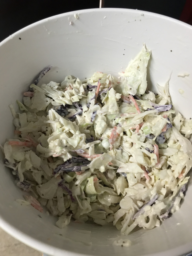 Slaw concocted from a variation of several different recipes consisting of mayo, sour cream, a little apple cider vinegar, blue cheese, a sprinkle of sugar to balance the tang and s&p. Bacon crumbles would blow people’s minds.