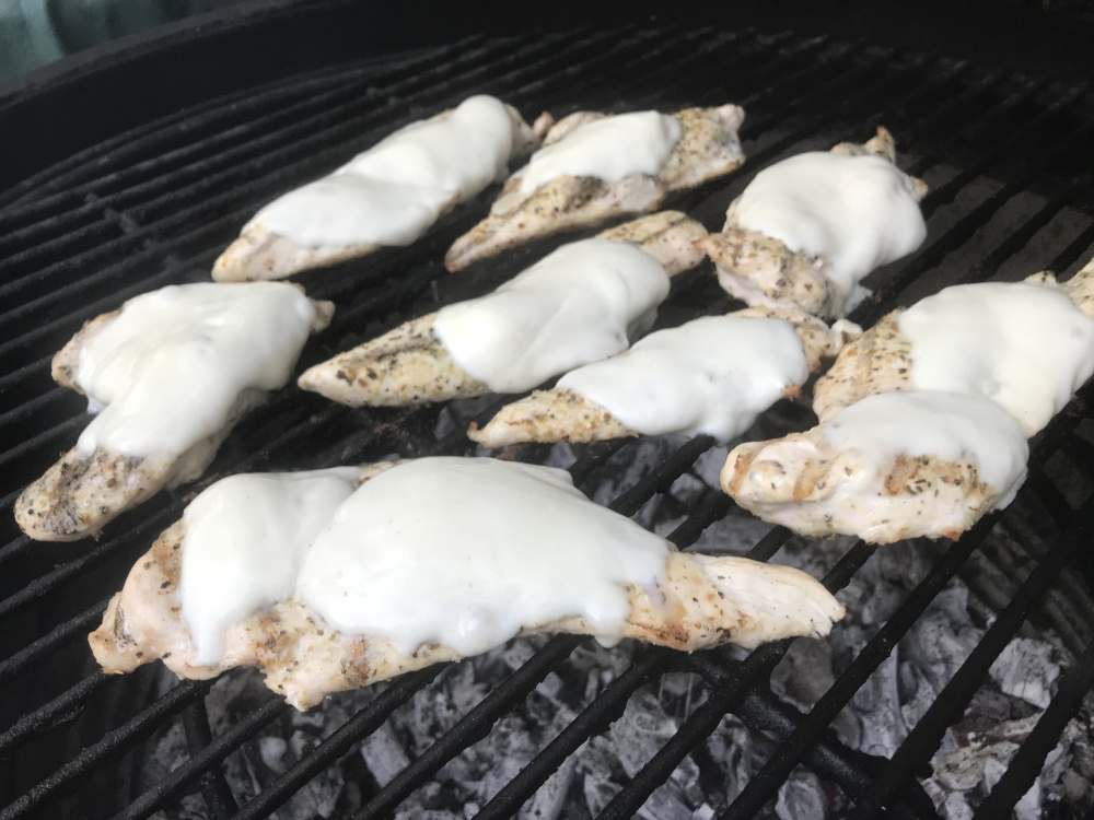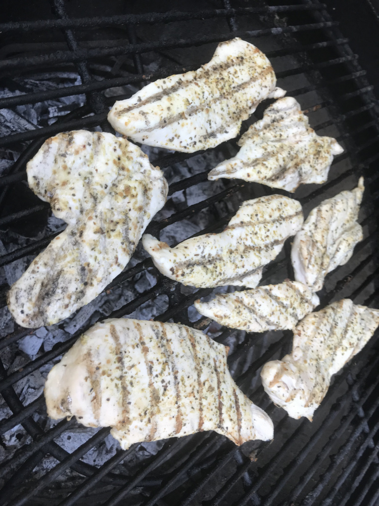 Pretty simple. Thin sliced breasts with a citrus basil rub, cooked hot and fast, topped with fresh mozzarella and topped with homegrown tomatoes and basil.