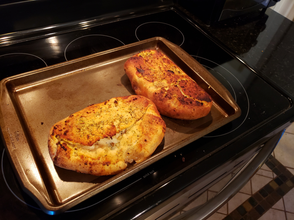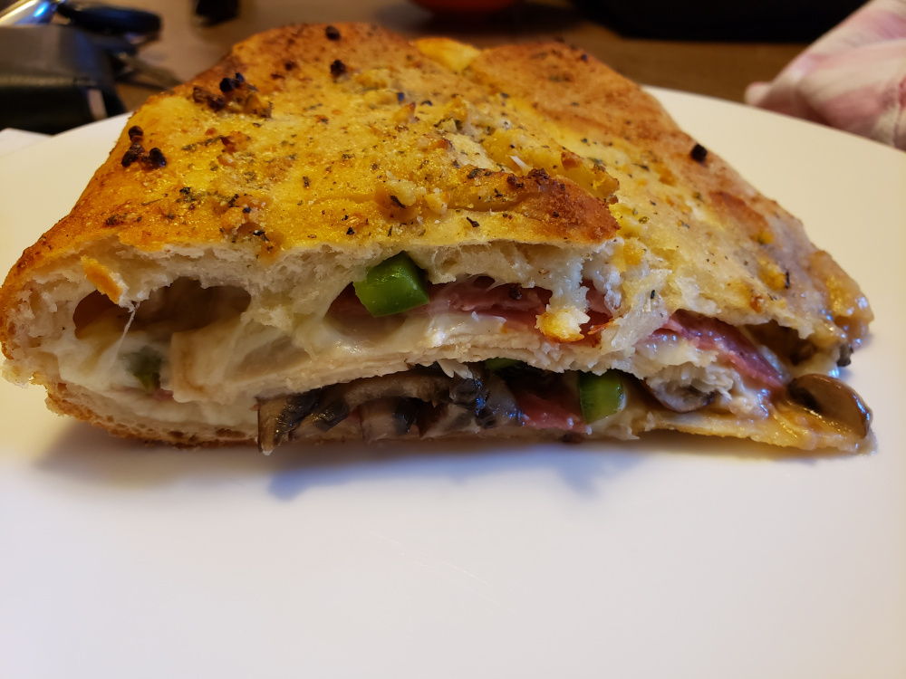 Inside I used mozzarella, hard salami, turkey, mushrooms and green peppers.  I used publix dough to wrap it all up.  For the baste I used the butter, some garlic and house seasoning.  The egg setup was platesetter in feet up, grid, pizza stone warmed up to 450 or so.  Cooked for 15min, flipped basted and cooked for another 15min.  The mrs was happy with it.  Tasted great, presentation wasn't there, but for the first time on the egg I'm happy.