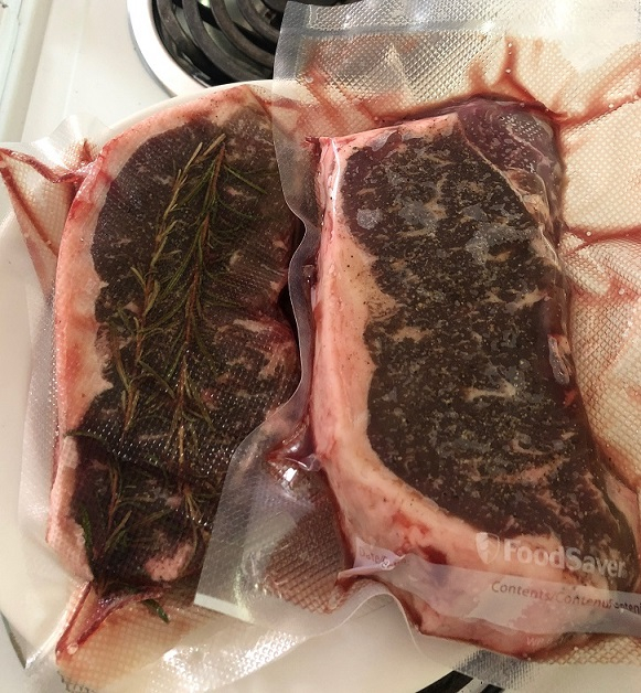 Steaks thawed, taken out of Vac Seal, S&P and one steak got some Rosemary.