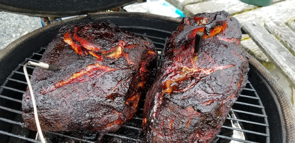 Decided to do 2 pork butts , injected with peach nectar then mustard slather and rubbed down with Meat Church Deez Nuts on one and The Gospel on the other, Rockwood and a few chunks of oak for the fuel source.  Spritzed with the peach nectar and apple cider vinegar, also ran the Meater probe for the first time and it worked great. Pork turned out awesome!!!!