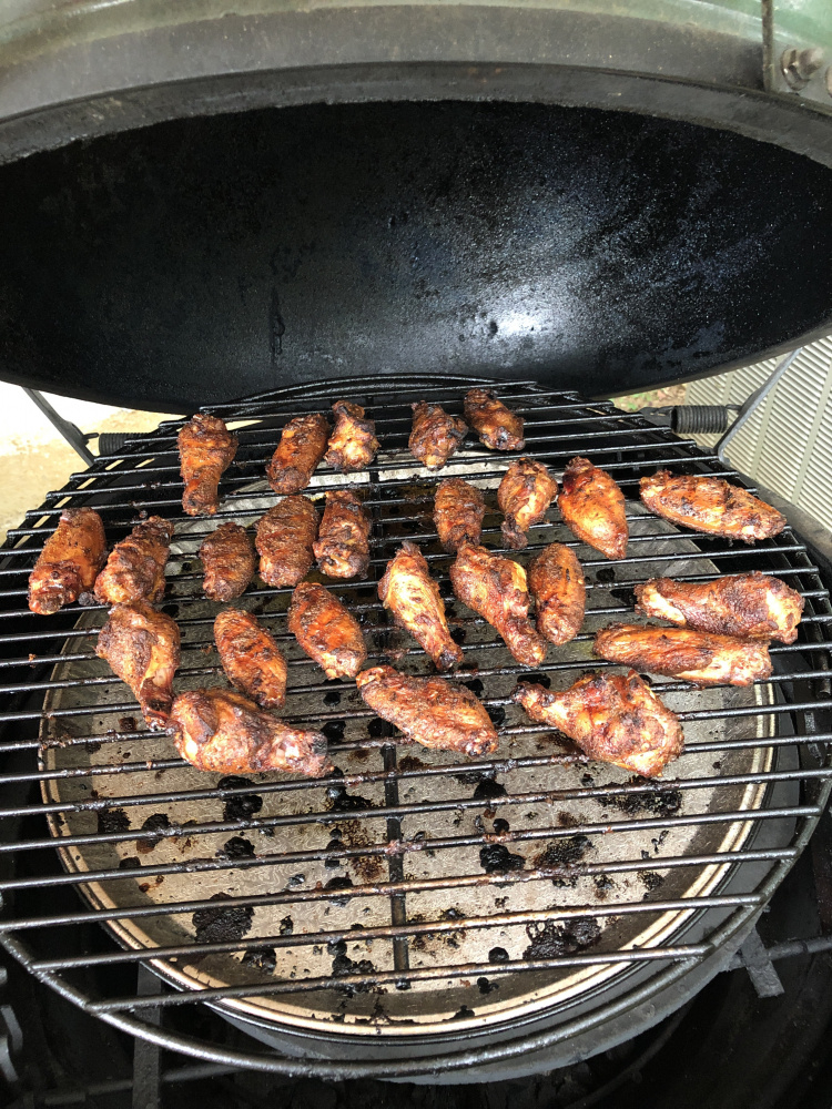 Been cooking on the egg since 7:30 this morning. I am done. I made a blue cheese sriracha sauce for dipping. 400°F raised indirect 1 hour, turned every 15 minutes, for a crispy deep fried flavor.