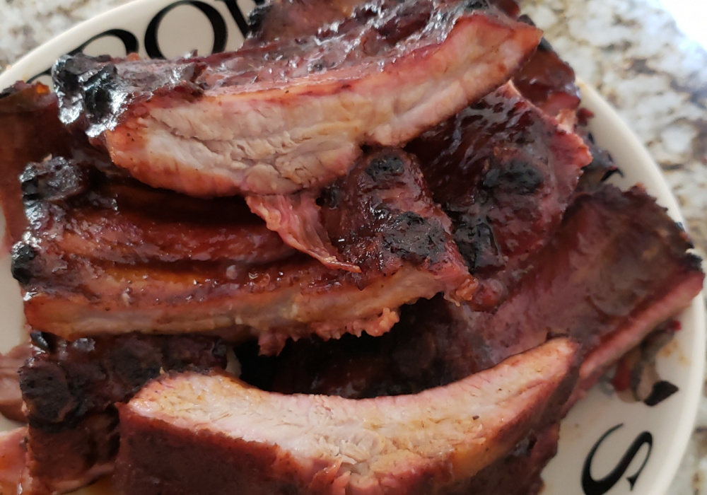 peach smoked, sweet and spicy ribs. Served with country green beans and potatoes, stewed heirloom tomatoes with sweet onion and black garlic with crusted bleu cheese.I hate it when I go to the kitchen for food and all I find are ingredients!