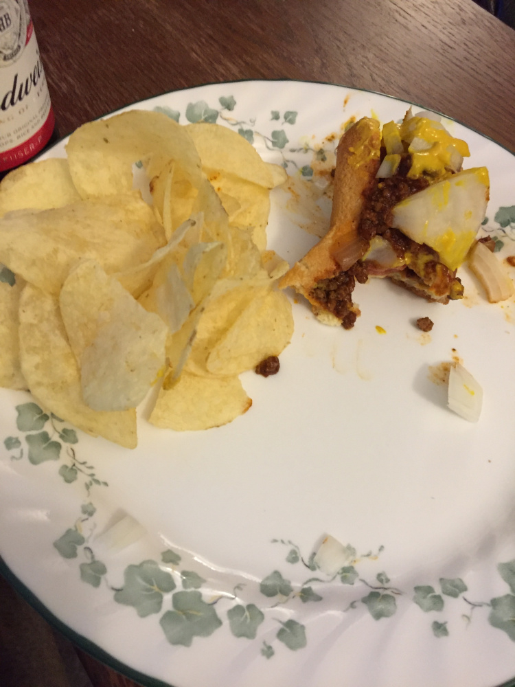 I didn’t think to take a plated photo, but here’s a partial coney (I texted this photo to my buddy as a teaser) from my dry run last weekend.