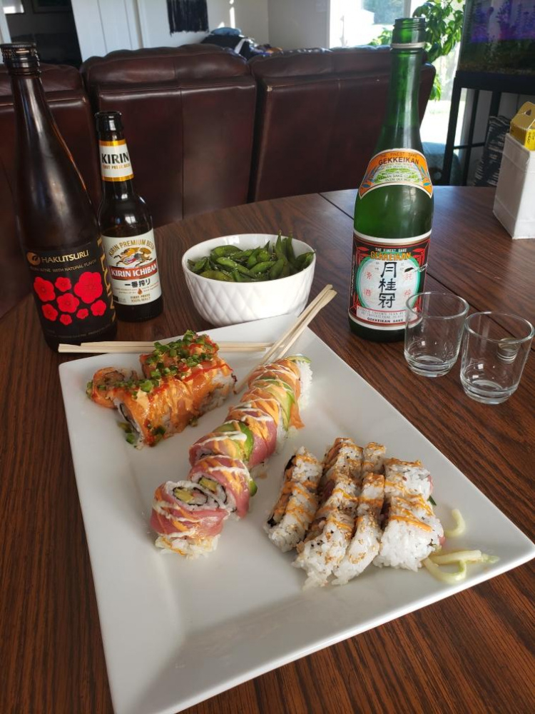 Plum wine, kirin beer, sake, edamame and sushi2 LBGE, Blackstone 36, Jumbo Joe