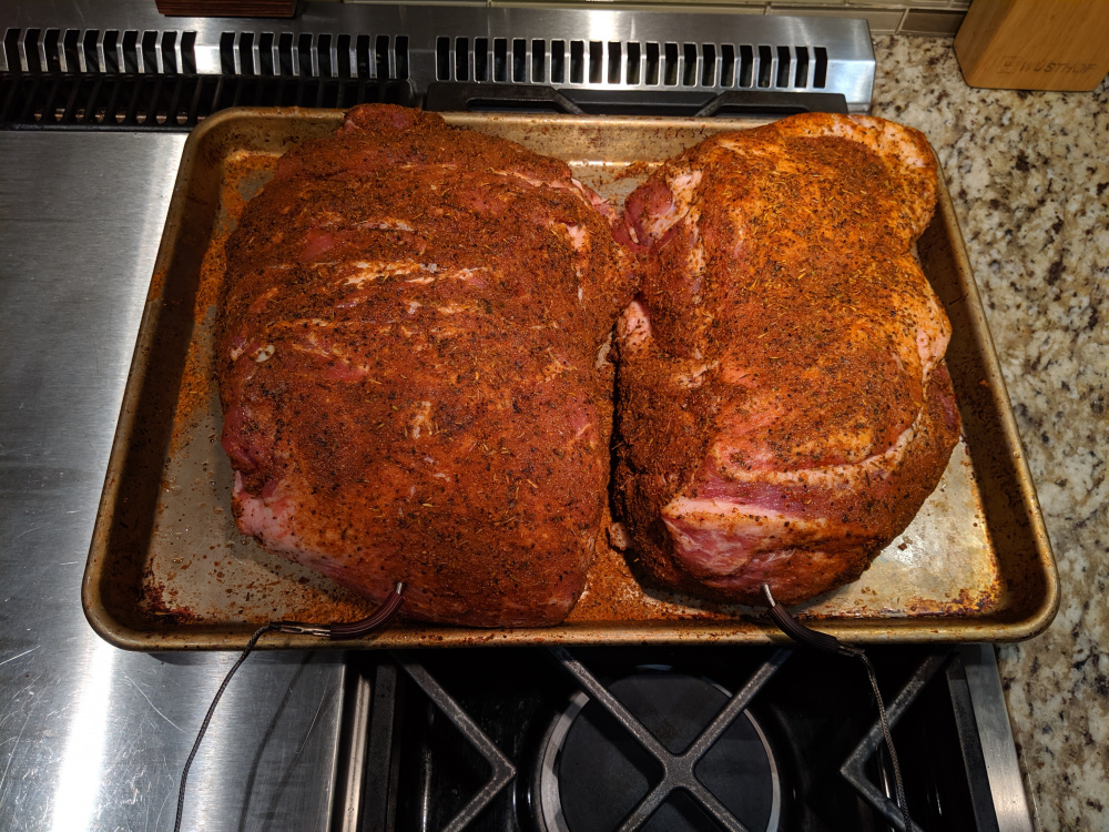 The butts reached temp in 4 hours, foiled and put in the oven for two hours. Out of 12 pounds, maybe half pound is left.