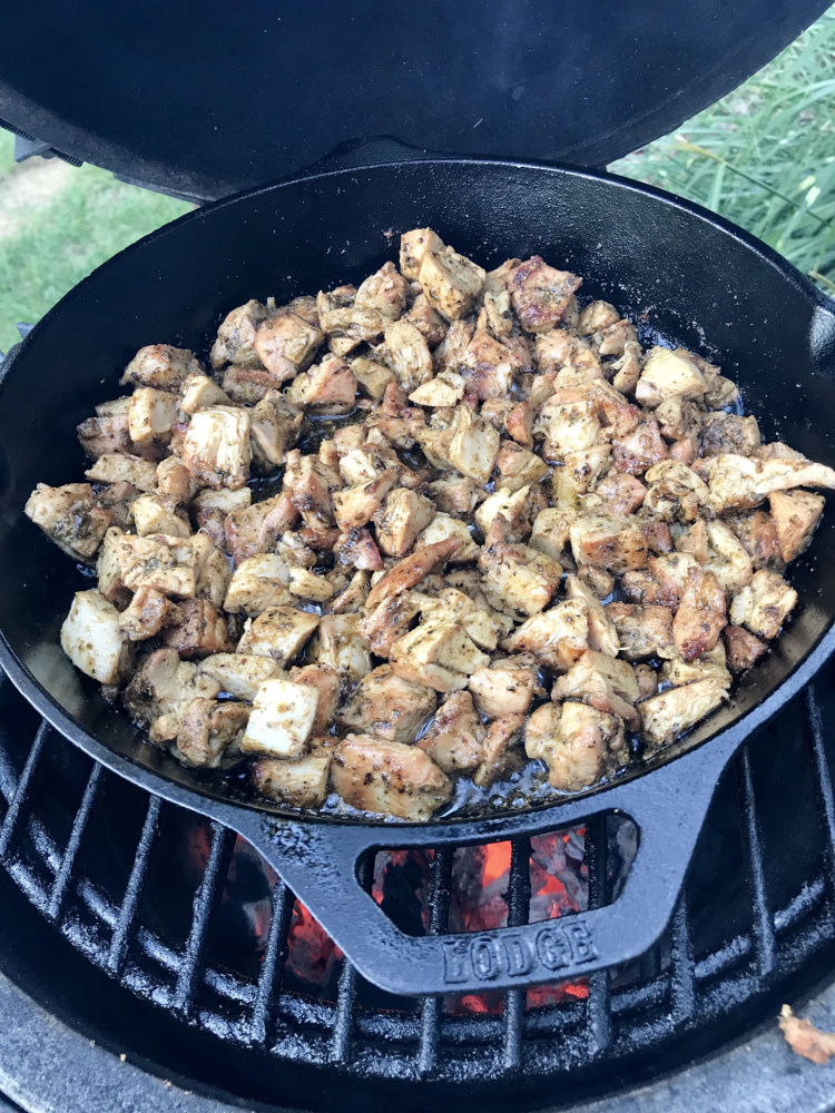 The thighs got chopped and thrown in the cast iron with a quick marinade of EVOO, Lemon Juice and DP Mediterraneanish so it would have seasoning on all sides