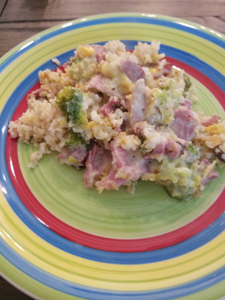 So decided to reincarnate my mom's ham, broccoli and rice casserole. Kept all ingredients the same except I used brown rice instead or white, even used Velveeta just like she used to. Baked in the egg at 375 for about an hour. The egg gave it a little different taste but made everything on the top nice and crispy. Pretty good use of leftover ham!
