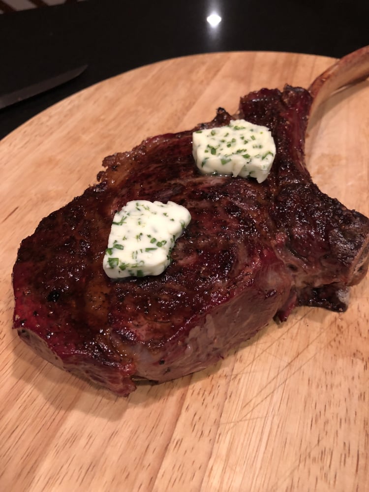 Dry aged beauty in the case.... had to try one! Worth the expense? I was going to find out. Reverse sear to 100 IT then cast iron to finish. A little chive butter while it rested.