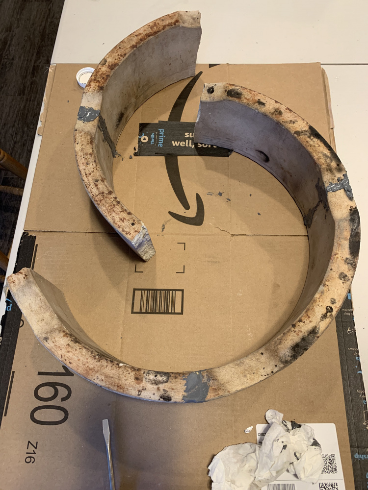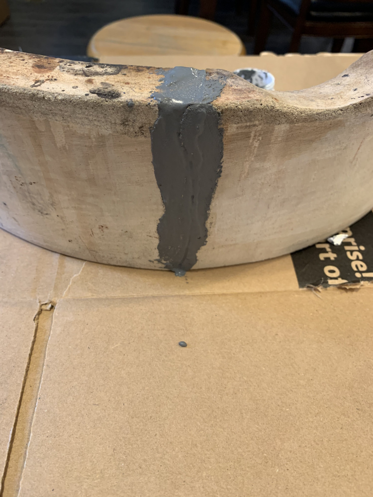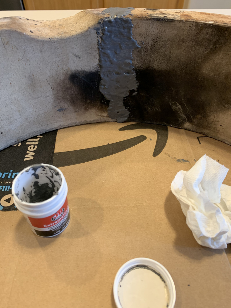 It took about half of the small container for this fix. I applied a generous amount to all edges, and pushed them together. Luckily this break kind of fit together, so even without the goo, it would lock together, so no bracing or anything was needed. I have a fire ring in five pieces, and a base that has cracks too. They are warranty cast offs from three of us in my extended family, so I’m putting together a Frankenstein egg for fun. -
