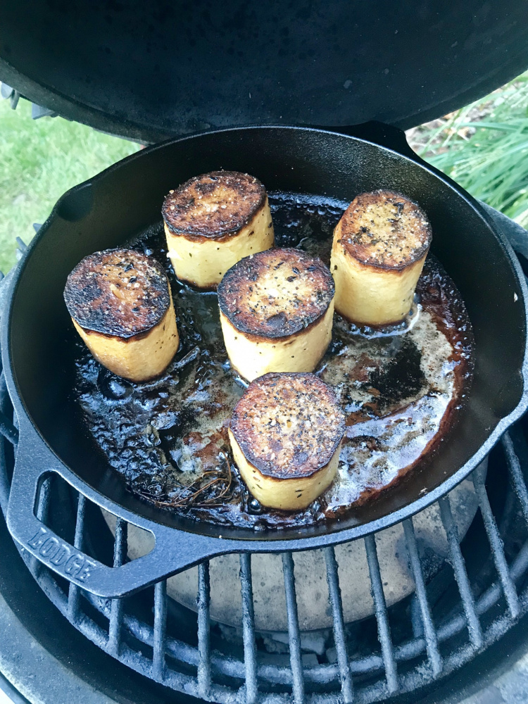 Cut 3 potatoes into 2” long cylinders.  Seared both ends in cast iron with some butter and thyme sprigs.  Once seared I added some chicken stock and moved to the small running 400 indirect to roast until soft.