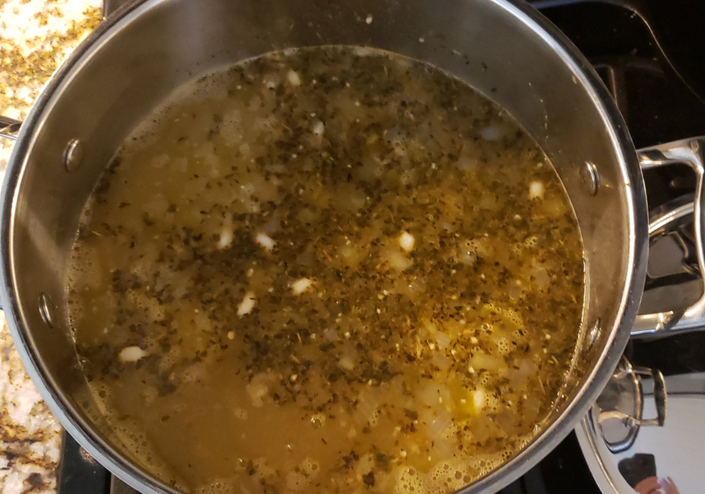 Placed in a pan with slightly salted water overnight, then after the saute of the garlic, onions, green chilis, oregano, chili powder and cumin, added with chicken broth to cook for a couple hours prior to adding the cooked chicken breasts."Knowledge is Good" - Emil Faber