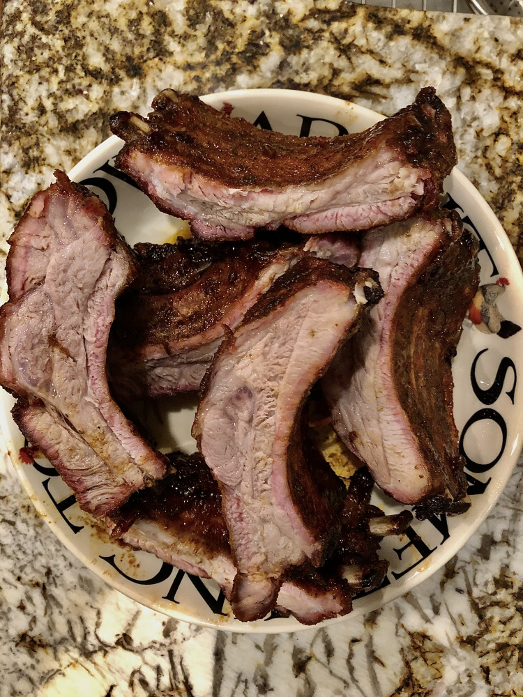 Smoked with 1 chunk of white oak, 5 chunks of peach.....perfect. 225F 4 hours.... then foiled bones up coated in honey, butter, and a Korean type BBQ sauce...... until tooth pick said it was done.