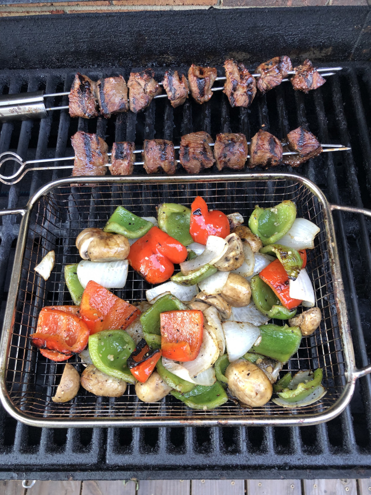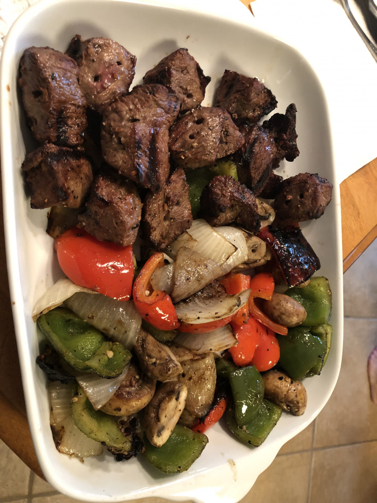 I grill sirloin kabobs every couple weeks. With onions and green peppers. Marinate them with a wet marinade from Kroeger, and grill to 130. Very tender, and serve with rice?
