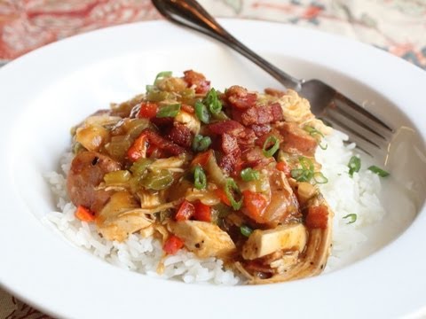Has poached, shredded chicken breast, andoille sausage, and bacon. I deviated from the recipe just a bit; used thighs instead of breasts, and grilled/smoked rather than poached, and while the grill was lit, why not blacken the bell peppers a bit too? I also didn't use quite as much bacon, as I ran out.