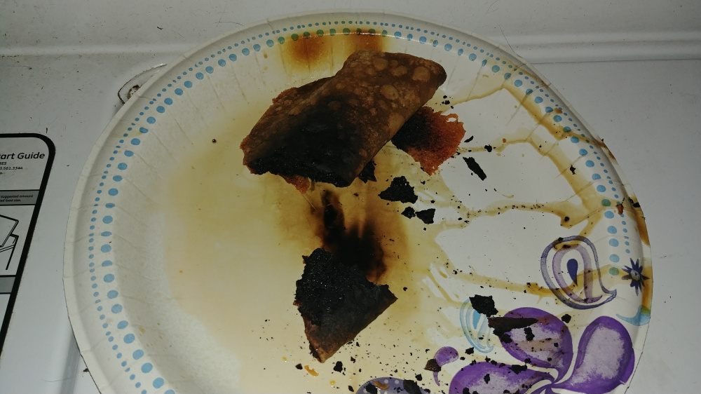 Said eggplant caught fire, so he grabbed it and threw it in the trash, which in turn started to smolder and smoke. So he grabbed that, and threw it out the backdoor.